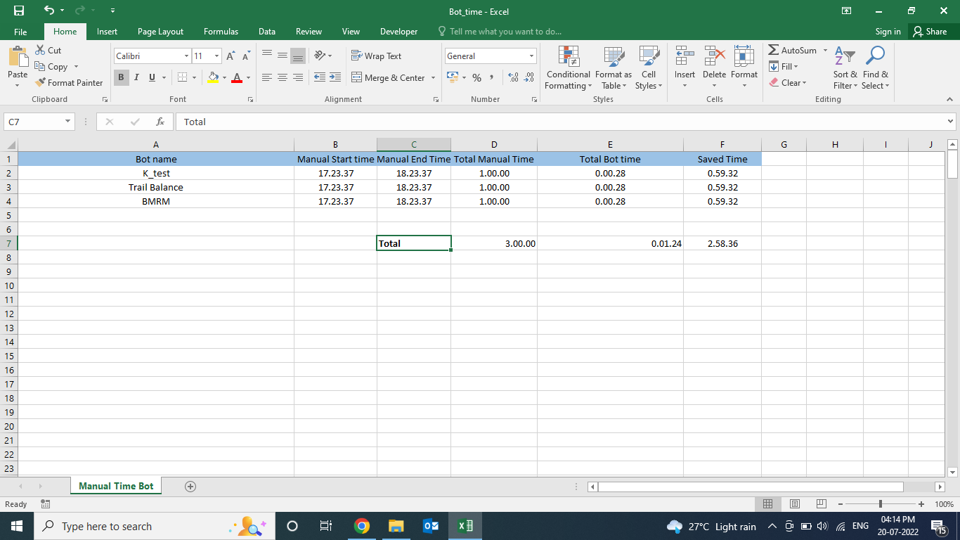 This bot calculates bot processing time and manual processing time, as well as the difference between the two, and the time saved as a result