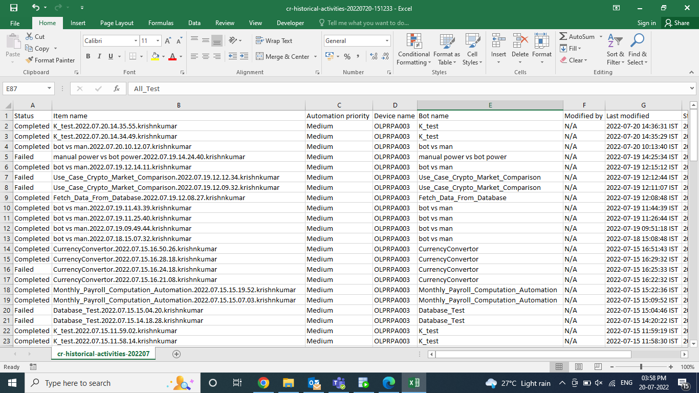 The bot will then fetch the data from the Excel sheet and download the log file from the bot dashboard, after which is will run a macro so it calculates the difference between the manual bot versus the bot process.