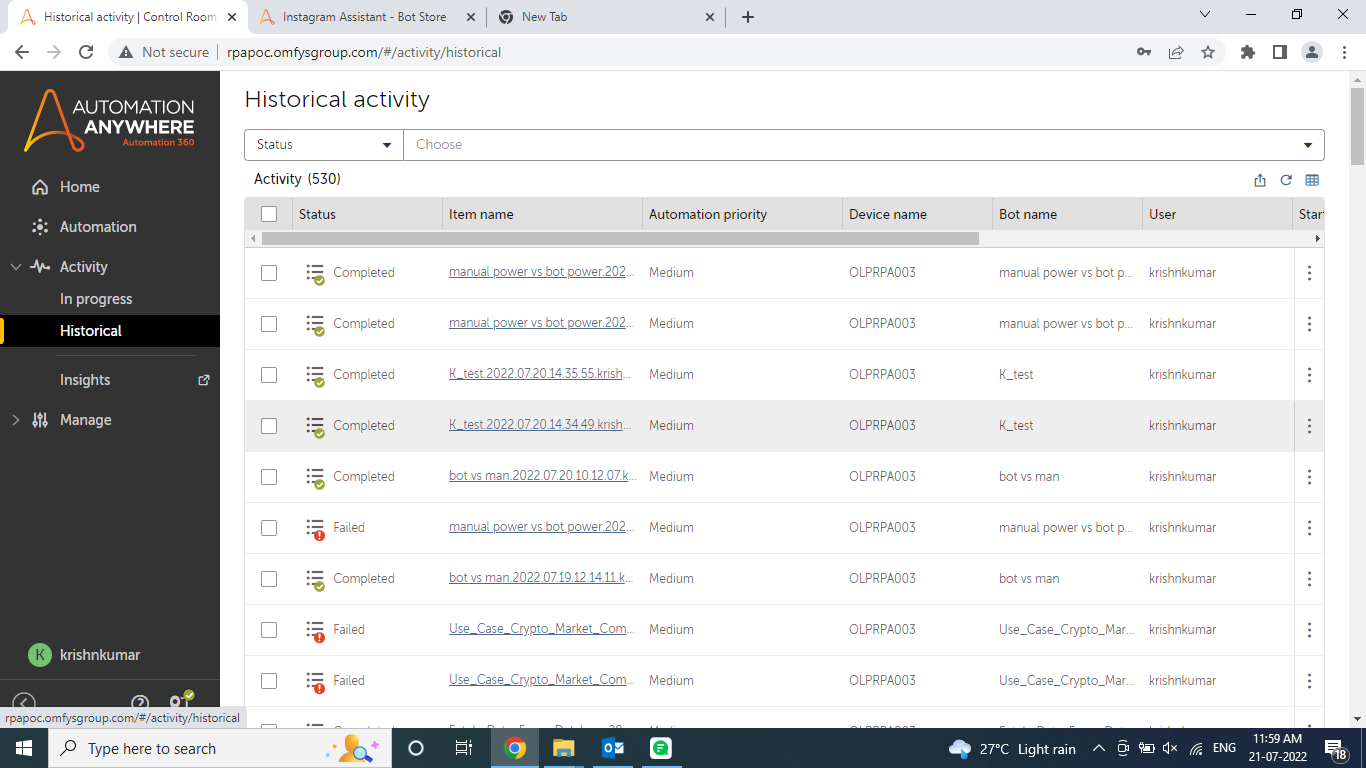 - Historical Link: Provided 1 url link value for fetch historical bot log data( Activity=>In progress=>Historical)