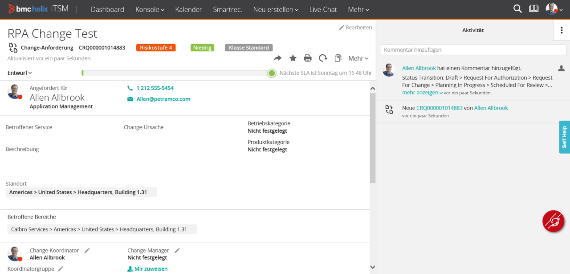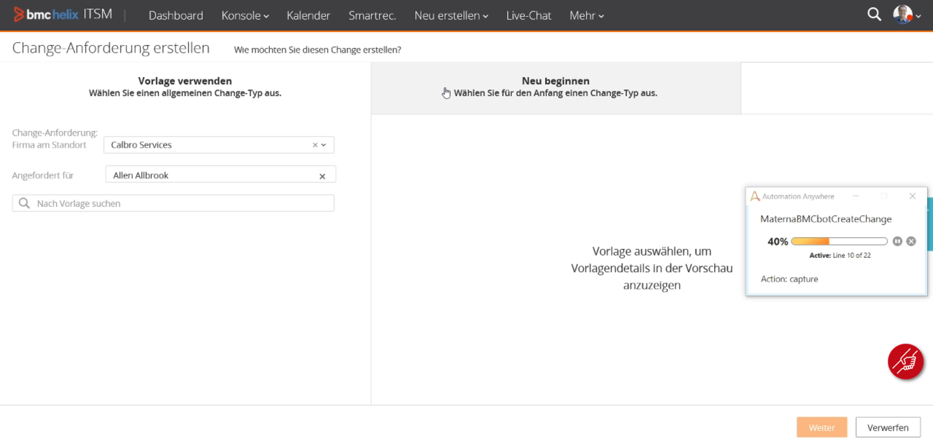 Do you need to create change requests quickly but you have to launch Smart IT all the time manually? The Materna Create Change Bot will do this for you! This bot is able to start BMC Smart IT, log in with credentials, and create a change request. This bot saves a lot of time and you could just customize the created change request.