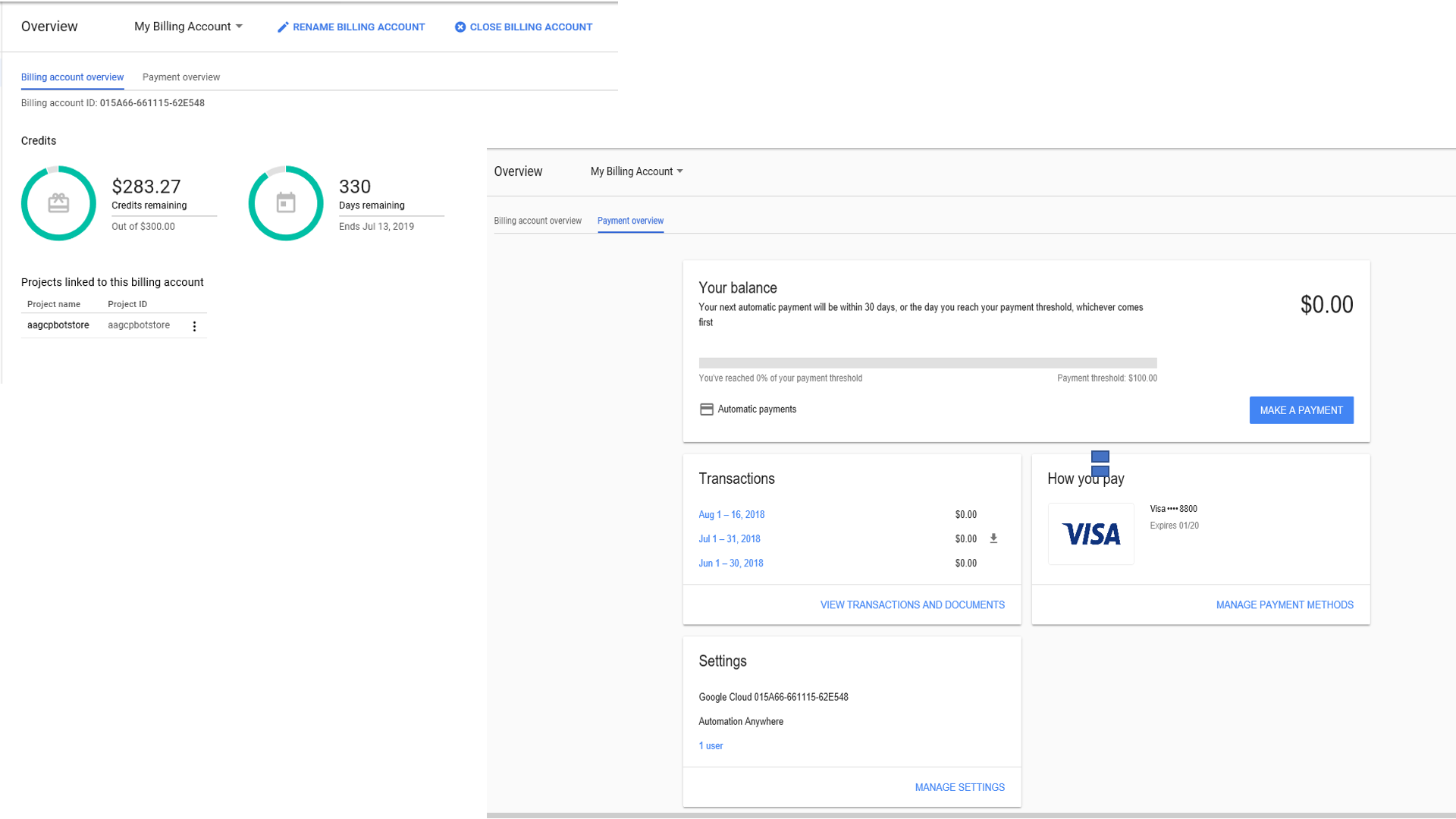 This bot captures the billing account overview, payment overview, last month invoice, and current month payment transactions in Google Cloud