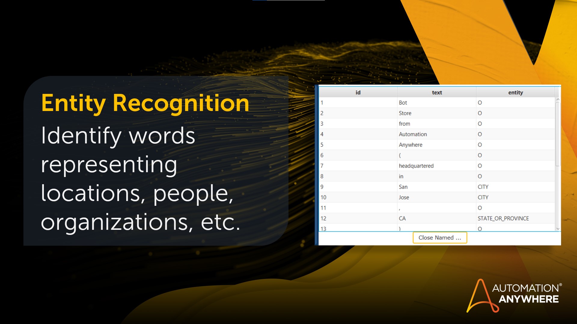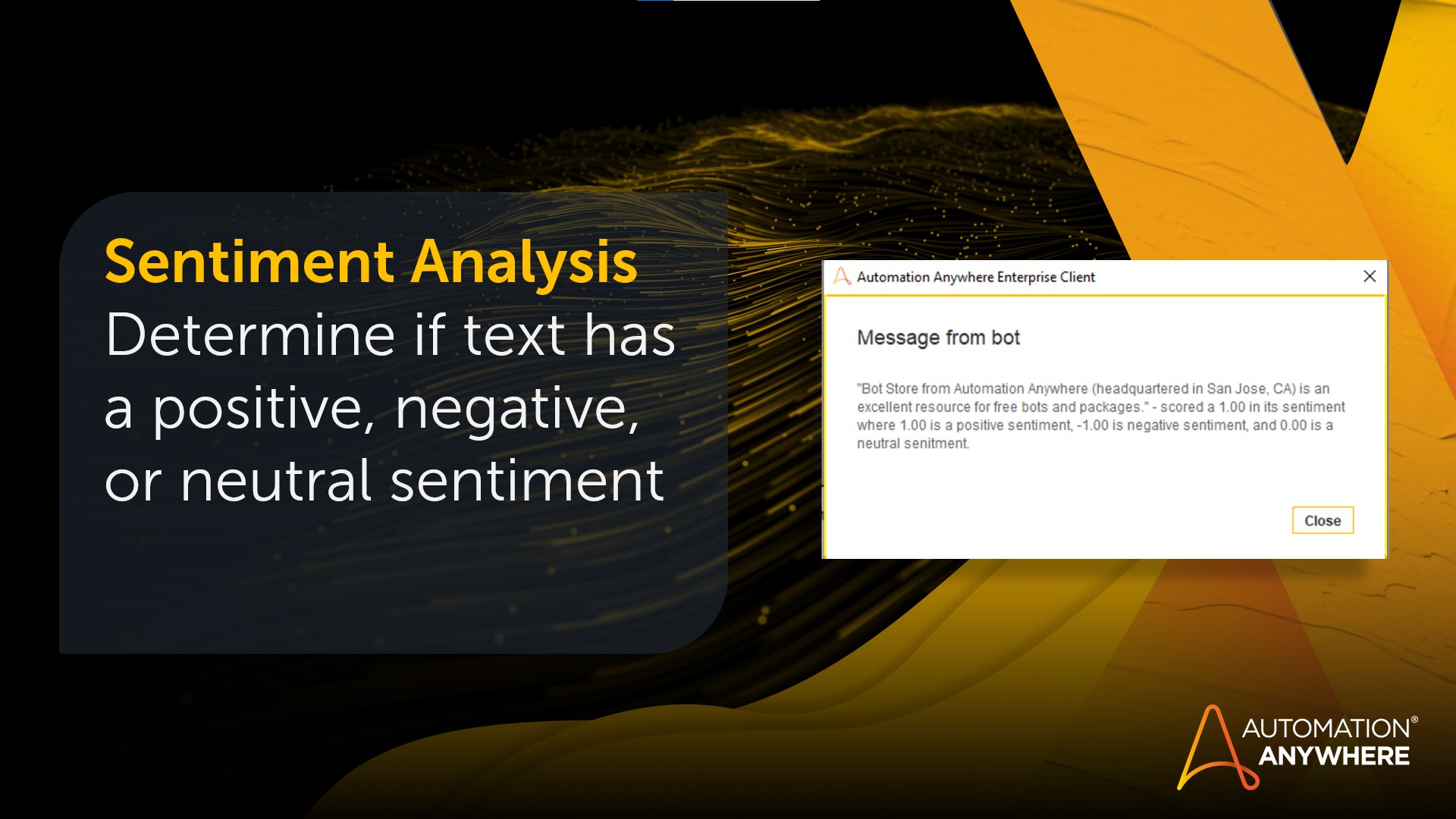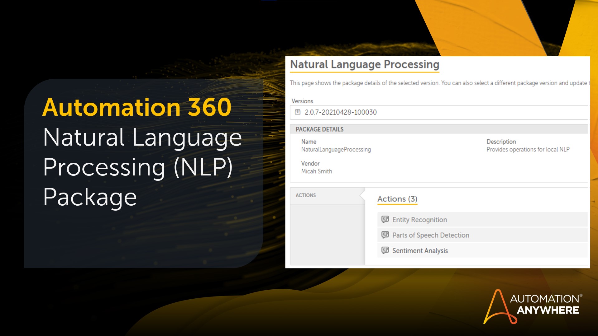 The Natural Language processing package enables bot builders to build intelligence into their automation through the analysis of free form text. This package is designed to perform Sentiment Analysis, Named Entity Recognition, and Part of Speech detection to provide Automation Anywhere bot builders with the ability to analyze text against a pre-trained NLP library provided by Stanford NLP Core.