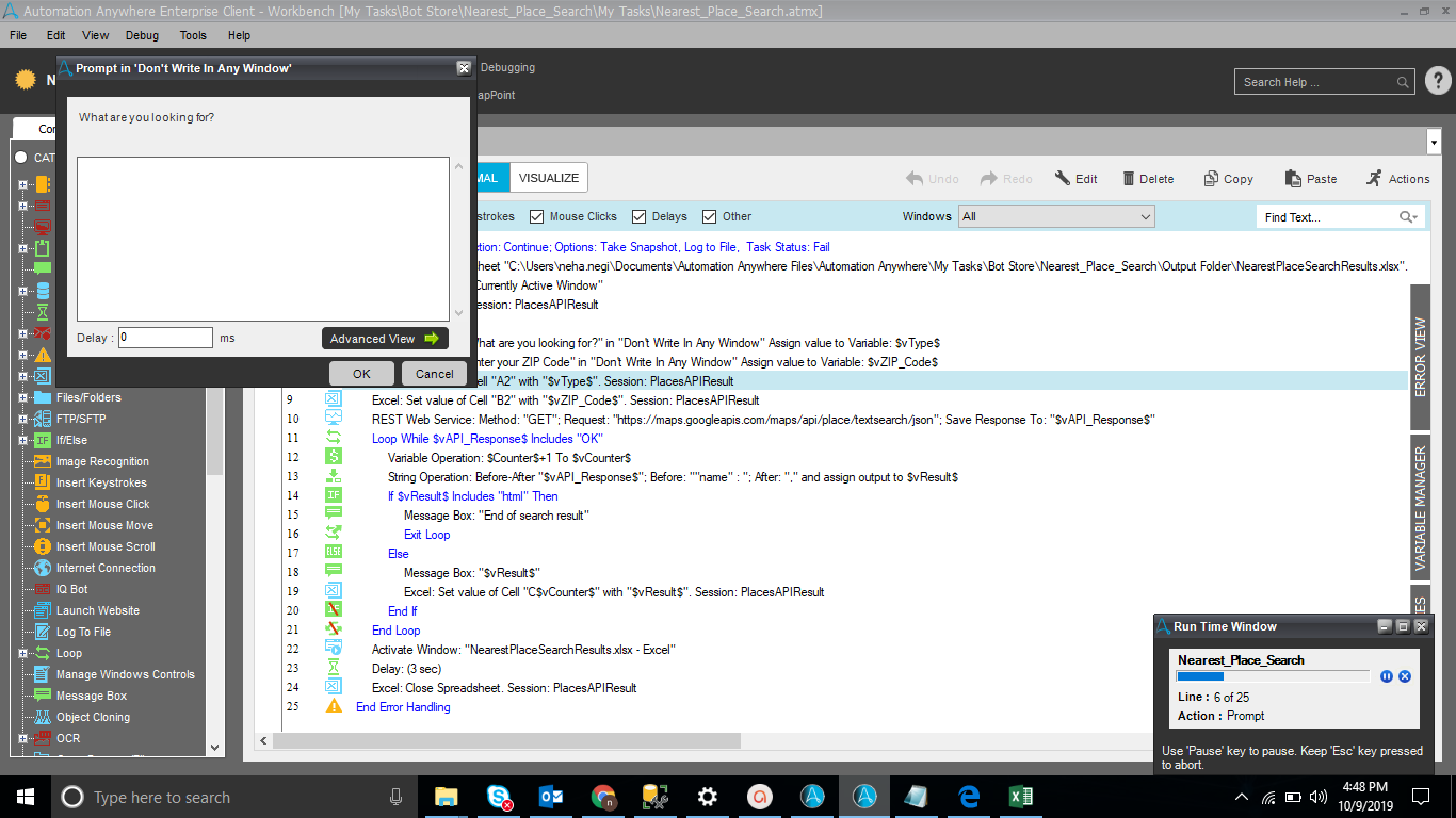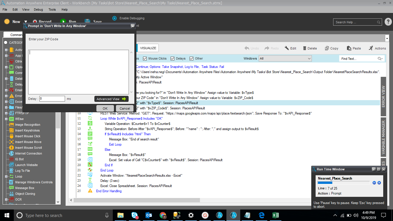Action: Bot queries Google Maps Place Search API, retrieves the results nearest to the Zip code entered, and displays in a message box, also show a message box indicating the end of search results.
