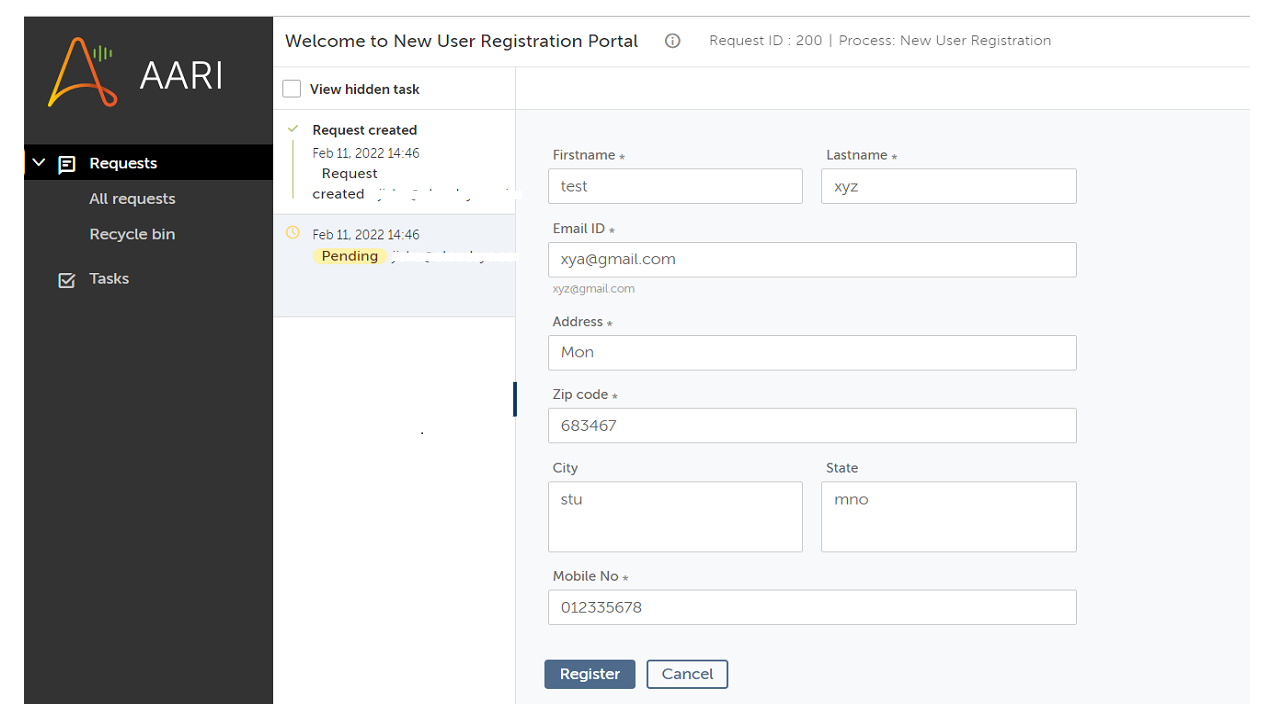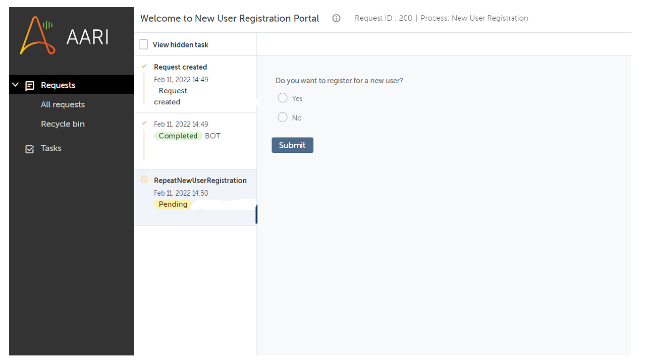 The New User Registration with Unique User ID is designed to fetch data of the user through AARI forms and record user details which result in creating a unique User ID. This will be stored in an Excel sheet. Users can repeat the flow if needed with new user registration or can cancel the process.