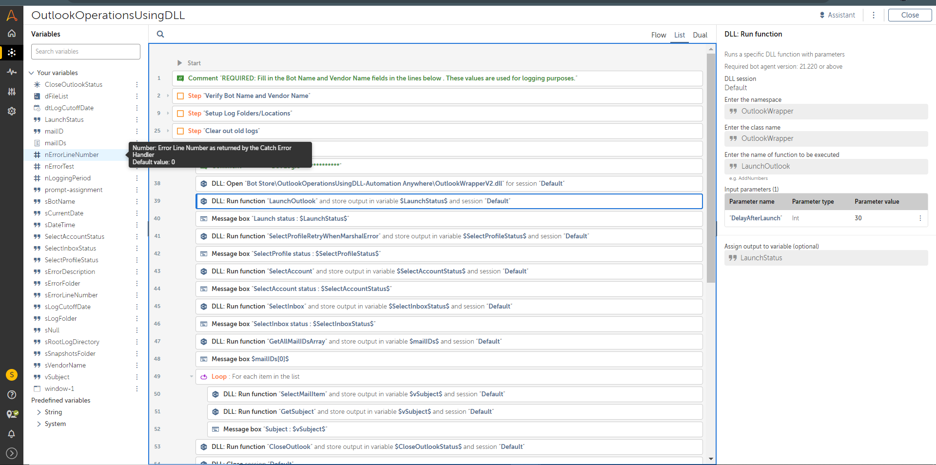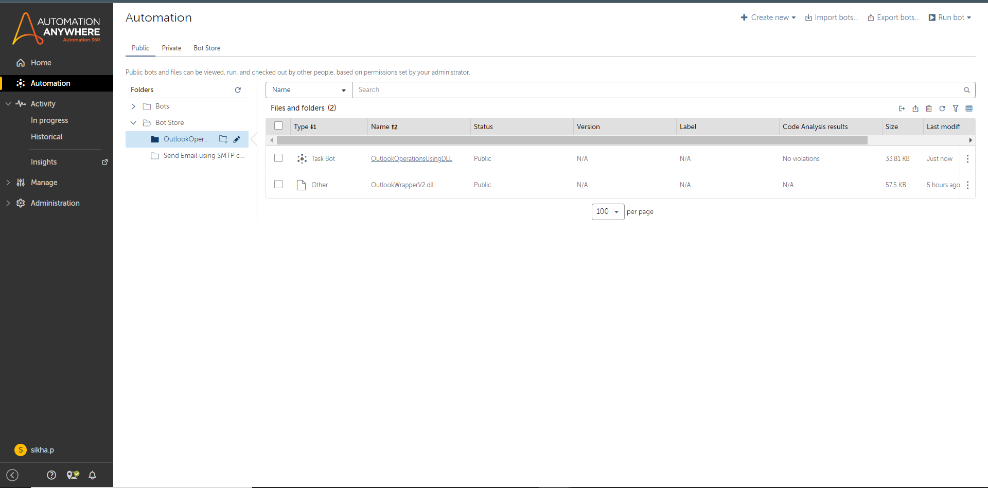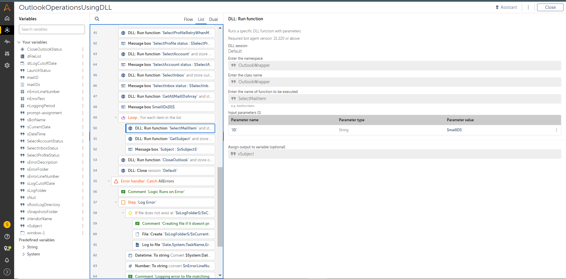 The source code for this bot and Dll file (C# code for the Dll, and the exported bot) is available on the Automation Anywhere GitHub page (https://github.com/AutomationAnywhere/A360-PerformVariousOutlookOperations)