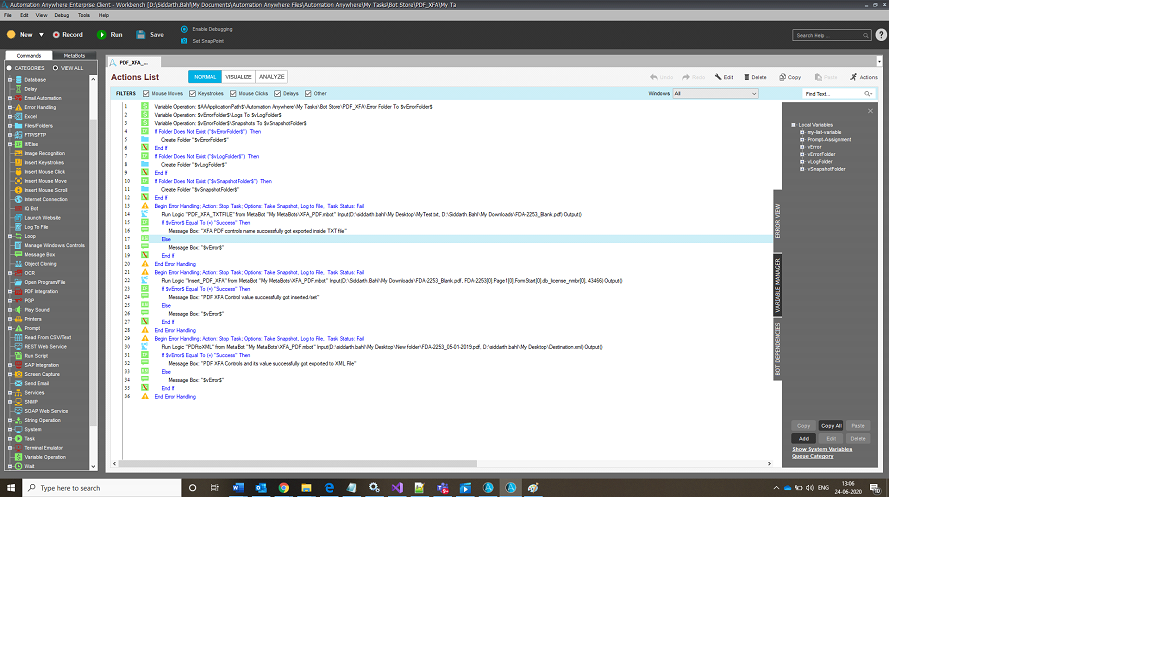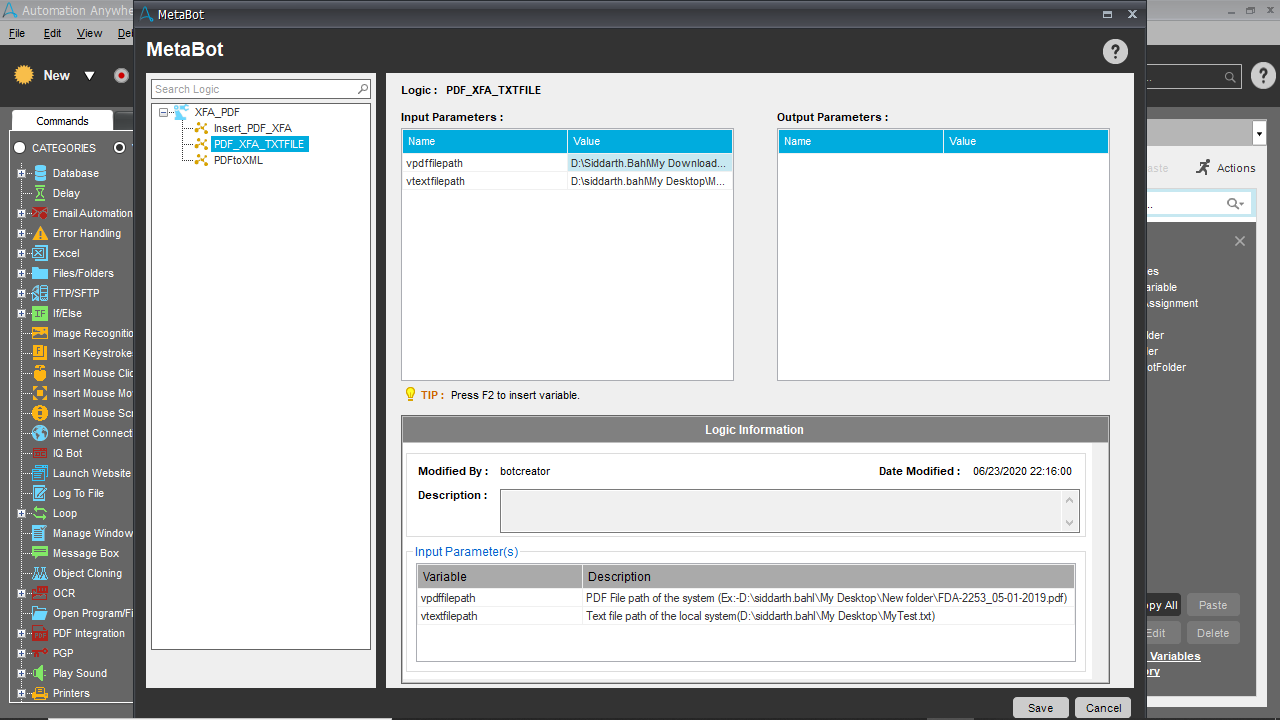 The PDF XFA Operation bot was created for reading and updating values from XFA formatted PDFs. The metabot is called from within the taskbot and enables developers to export control names, update values based on control names, and read the contents of the PDF out to an XML file. The metabot has three functions: