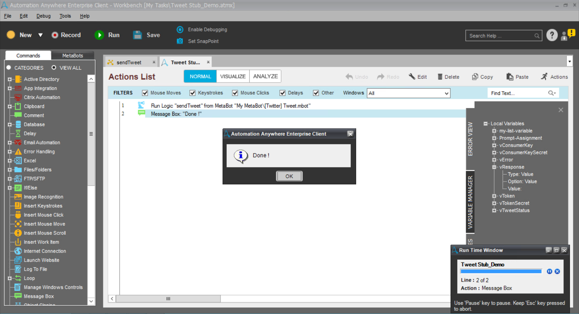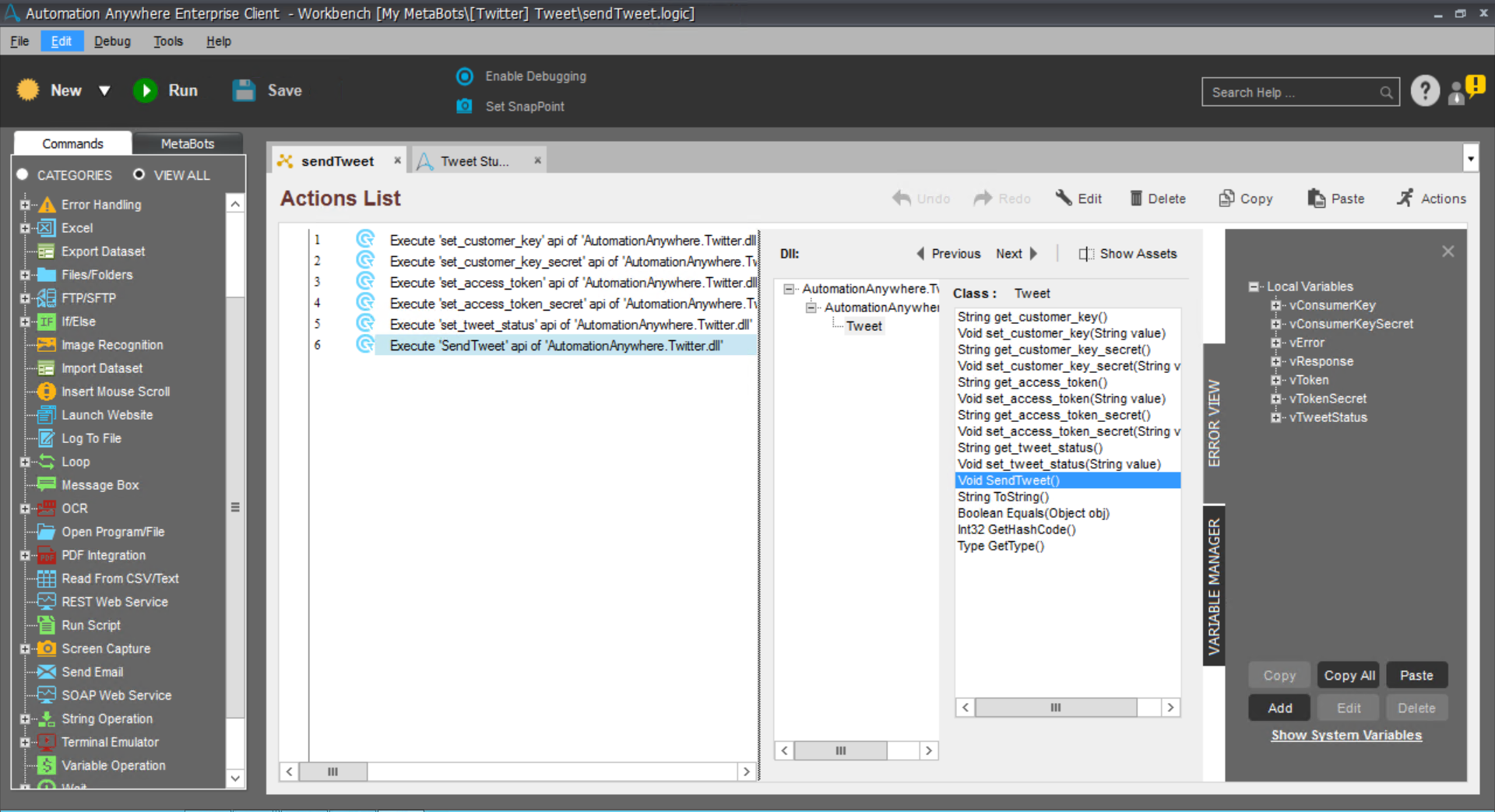 The Post New Tweet in Twitter bot can be used to automate the process of posting tweets from a bot. Authenticate, provide some basic details & a tweet - and your bot is off and running ready to go, posting to Twitter on your behalf.