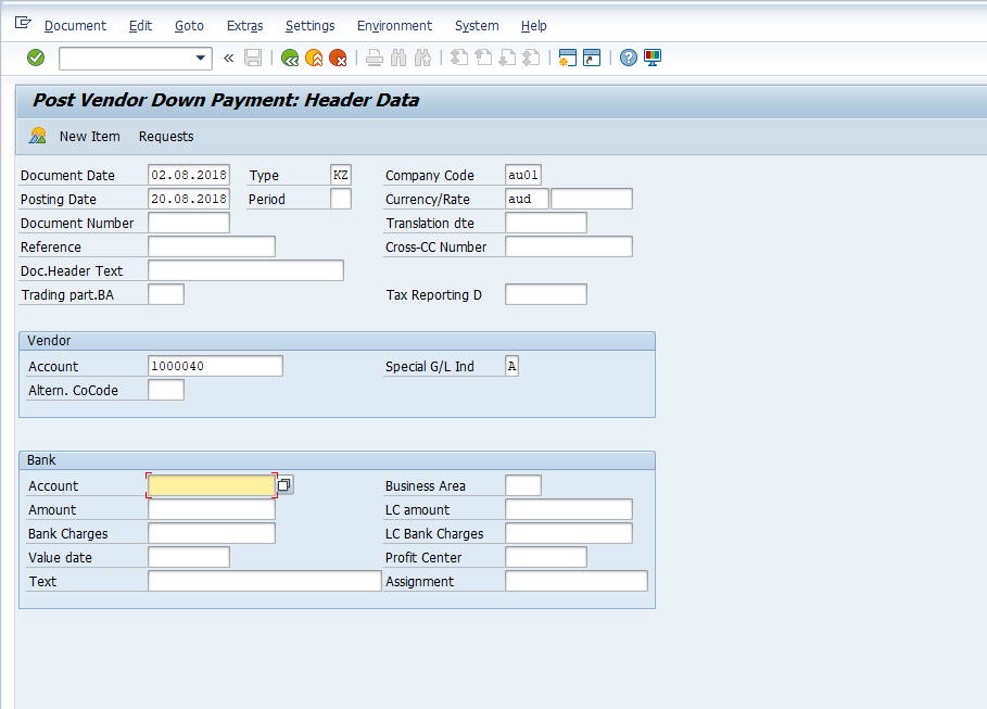 - Inputs: User ID, password, document date, vendor, and bank account, number amount