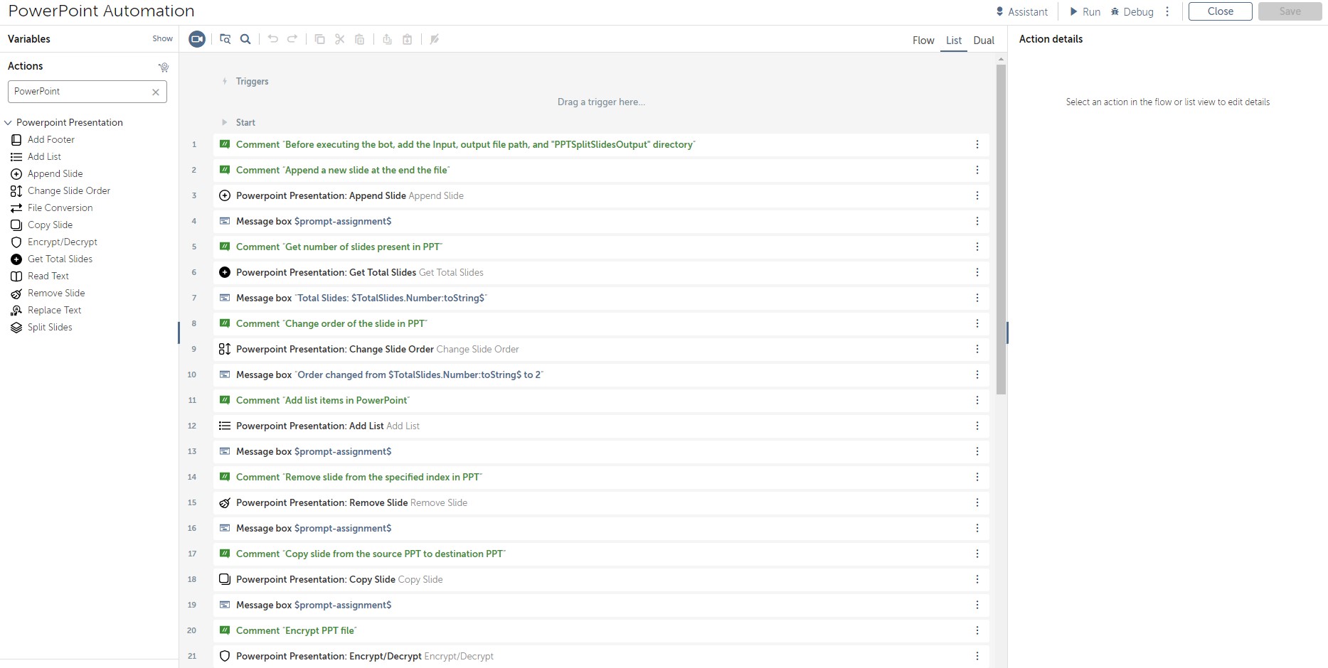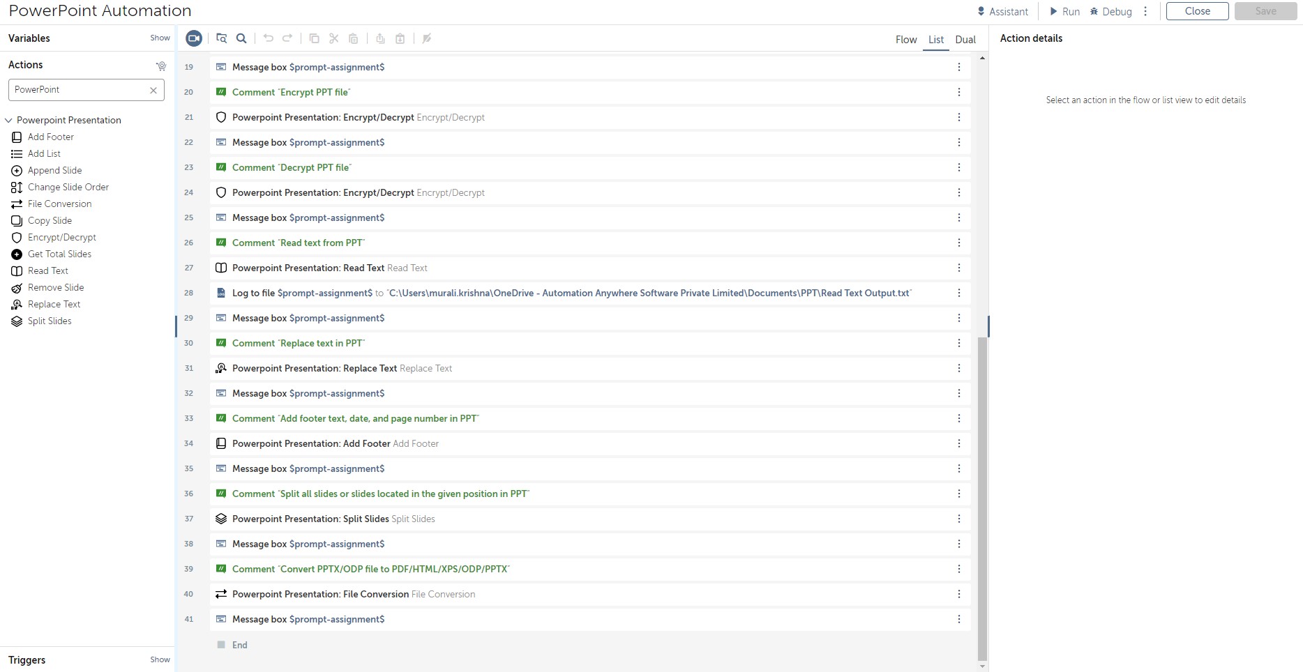 For example: In the Read Text action you need to pass the input ppt file path to read all text and get the result in an output string type variable.