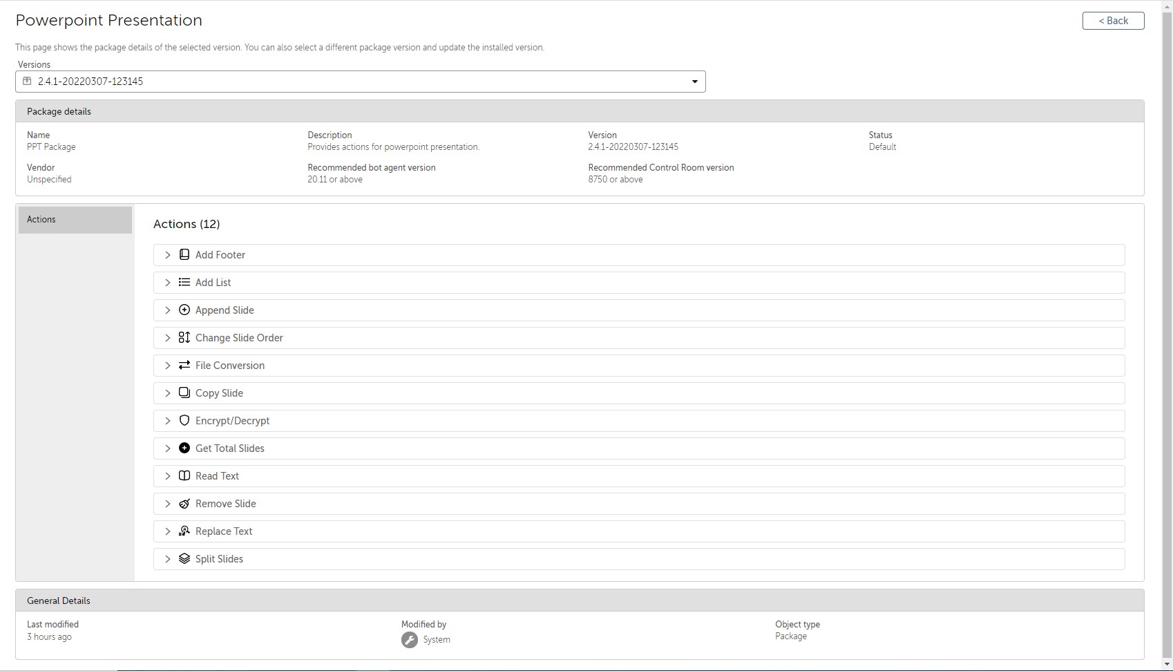 PowerPoint Presentation is a custom package created for automating actions in PowerPoint Presentation files. It includes 12 different actions such as Read Text, Split Slides, Add List, Add Footer, Append Slide, Change Slide Order, File Conversion, Copy Slide, Encrypt/Decrypt, Get Total Slides, Remove Slide, and Replace Text.
