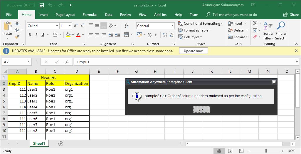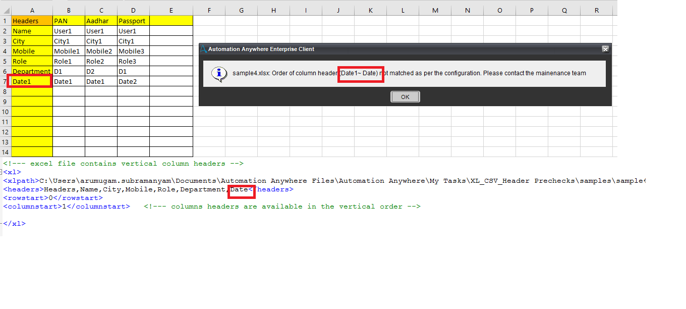 - Most of the processes skip the header validations due to the extra coding effort required, apart from the business rules and requirements. Before you run, you have to map the input file path and headers in the XLReusableBOT.xml file