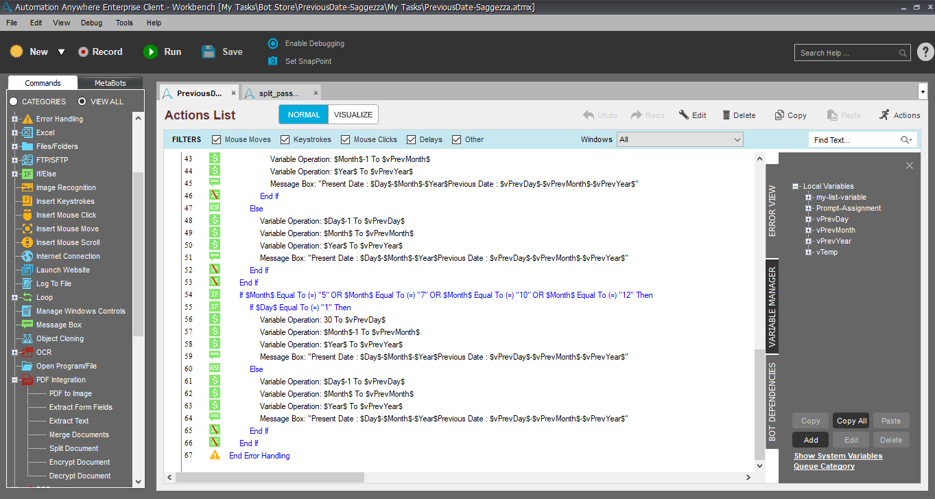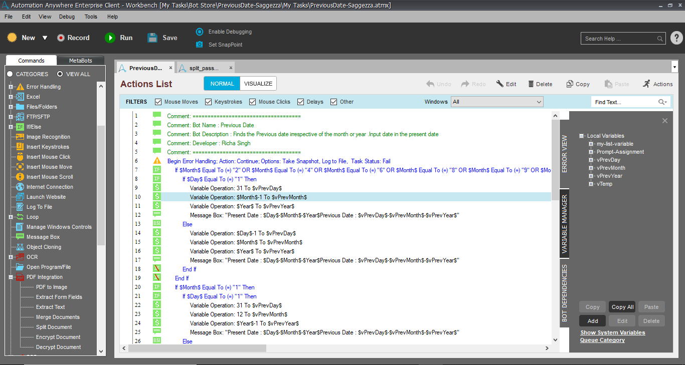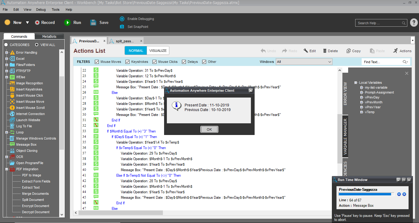Actions: This bot helps with the logic of finding the previous date irrespective of the month, year, or leap year.