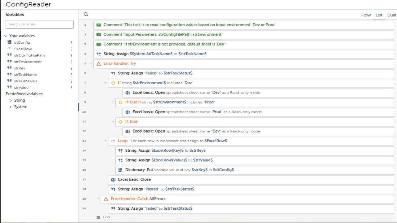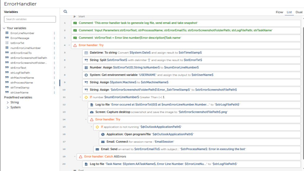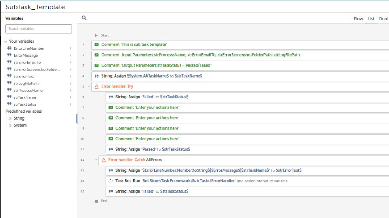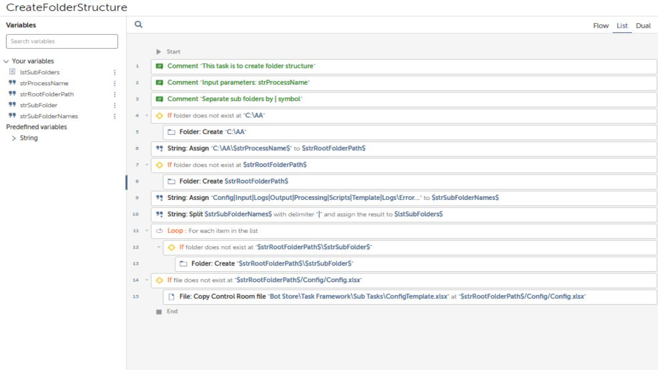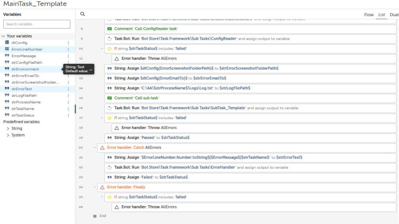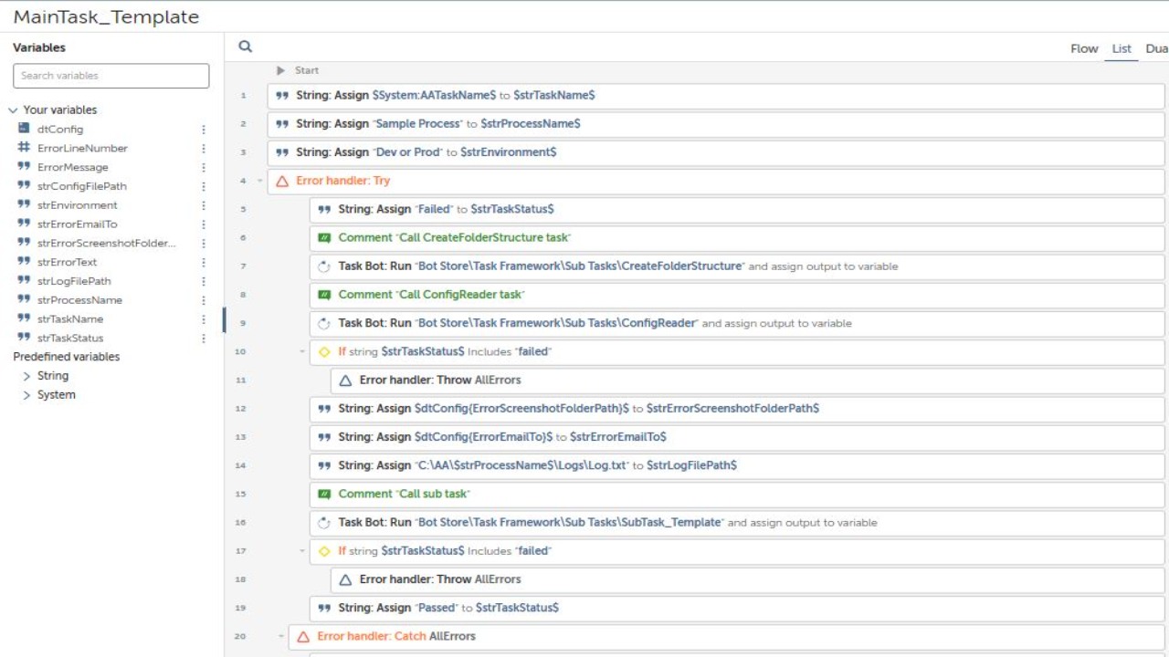 This is more like a framework for all your processes using Automation Anywhere software. It includes variables for process folders, such as config, input, outputs, utilities, logs, temporary, and snapshots, as well as time and date variables. The task bot also includes a try-catch block to handle errors and ensure smooth operation.