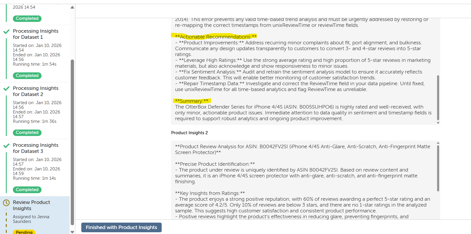 You are given two outputs, one is a sentiment analysis score for each data point that contains product review text, and finally an approximately 200 to 500 word product insights write up for each of the top three most reviewed items in the dataset (please see the youtube video for instructions on how to add additional product insights, if you would like it to return more than three).