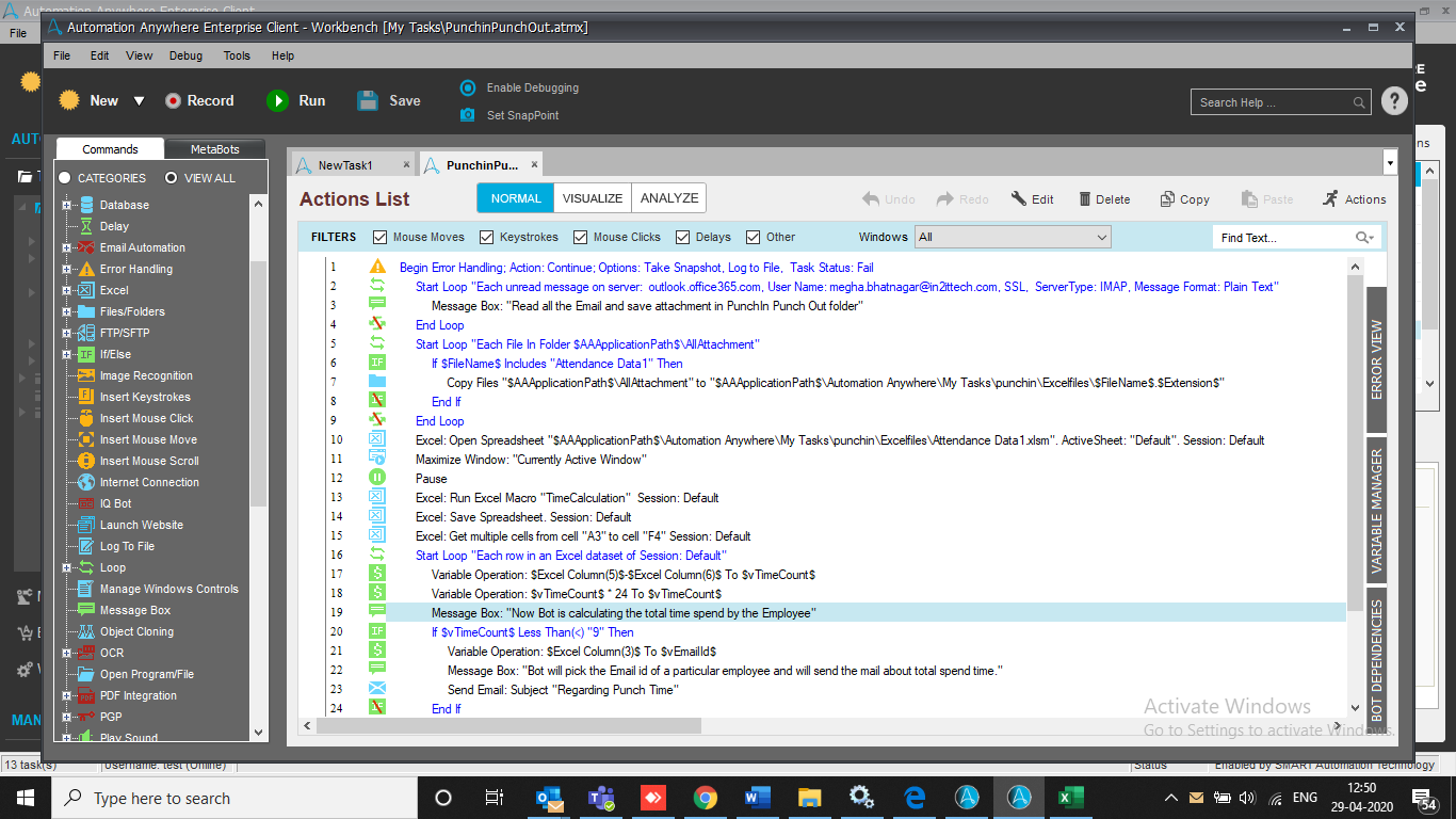 Now the Bot will go to the 'All attachment' folder and will read the Attendance Data1 file. If the file name includes Attendance Data1 then it will move this file to the Punch-in Punch-out folder.