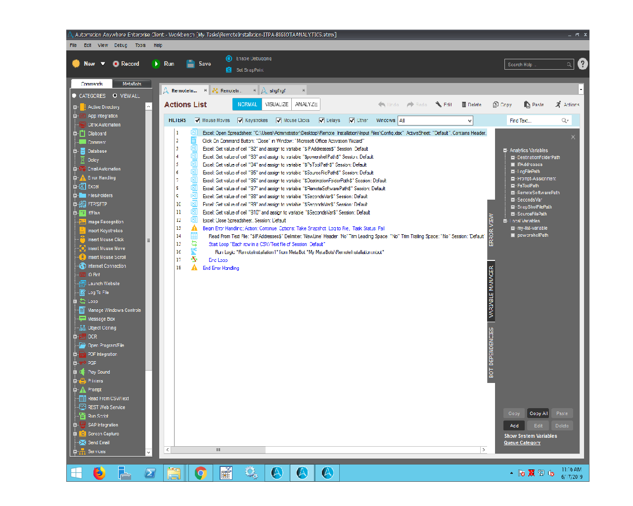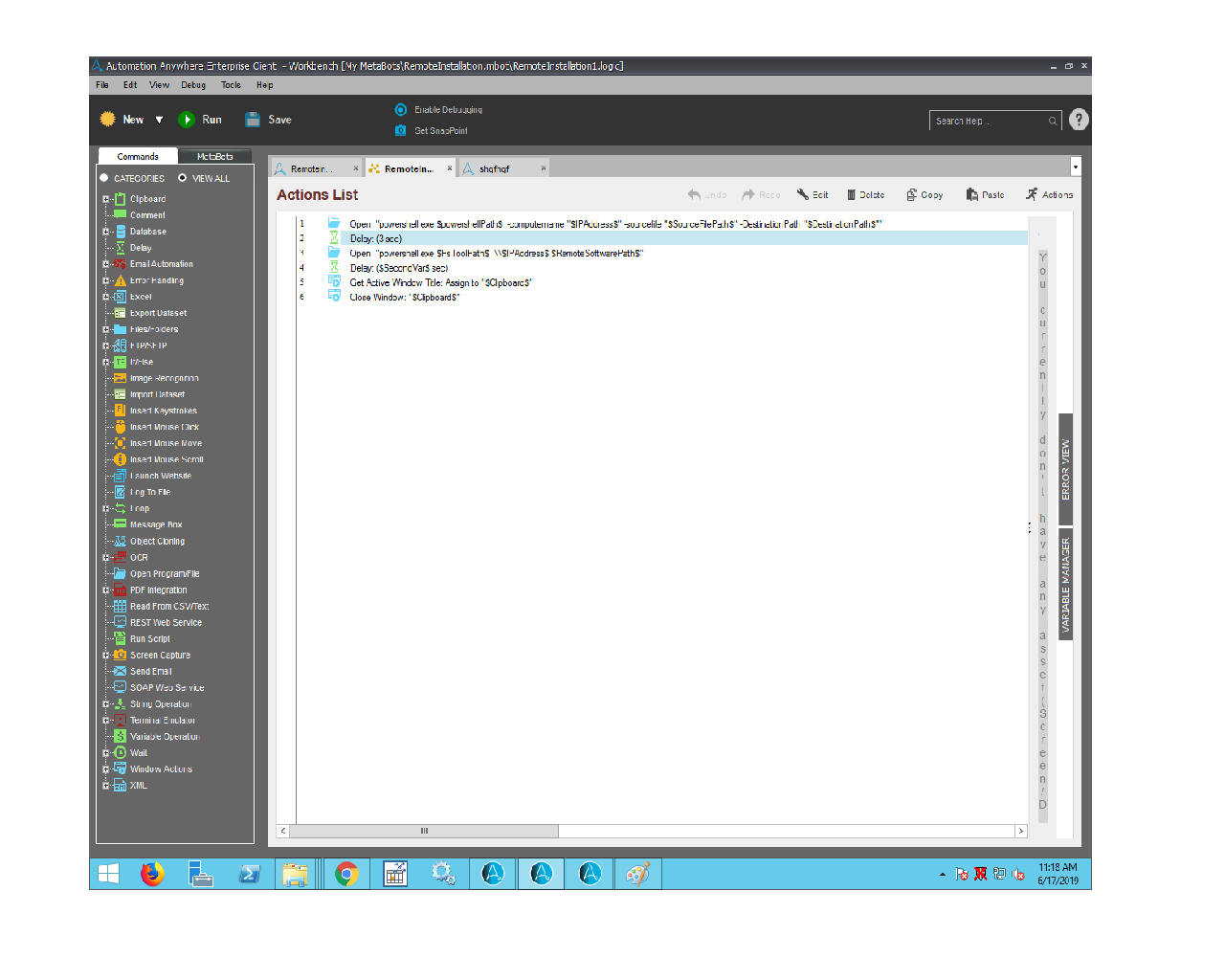 The Bot installs provided software/application/patch on remote machine . • The Bot does the remote installation of patches, OEM upgrades, application software and application upgrades, in silent mode. • The Bot, after installation, also verifies the installation via task manager if the application is running fine and checks the versions of the upgrades. • Reads the IP addresses from the text file and copy the software on the remote machines also install the software on the same. • The Bot uses PowerShell