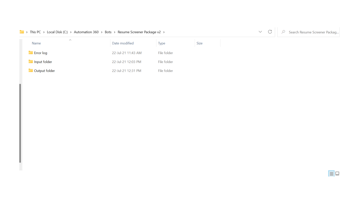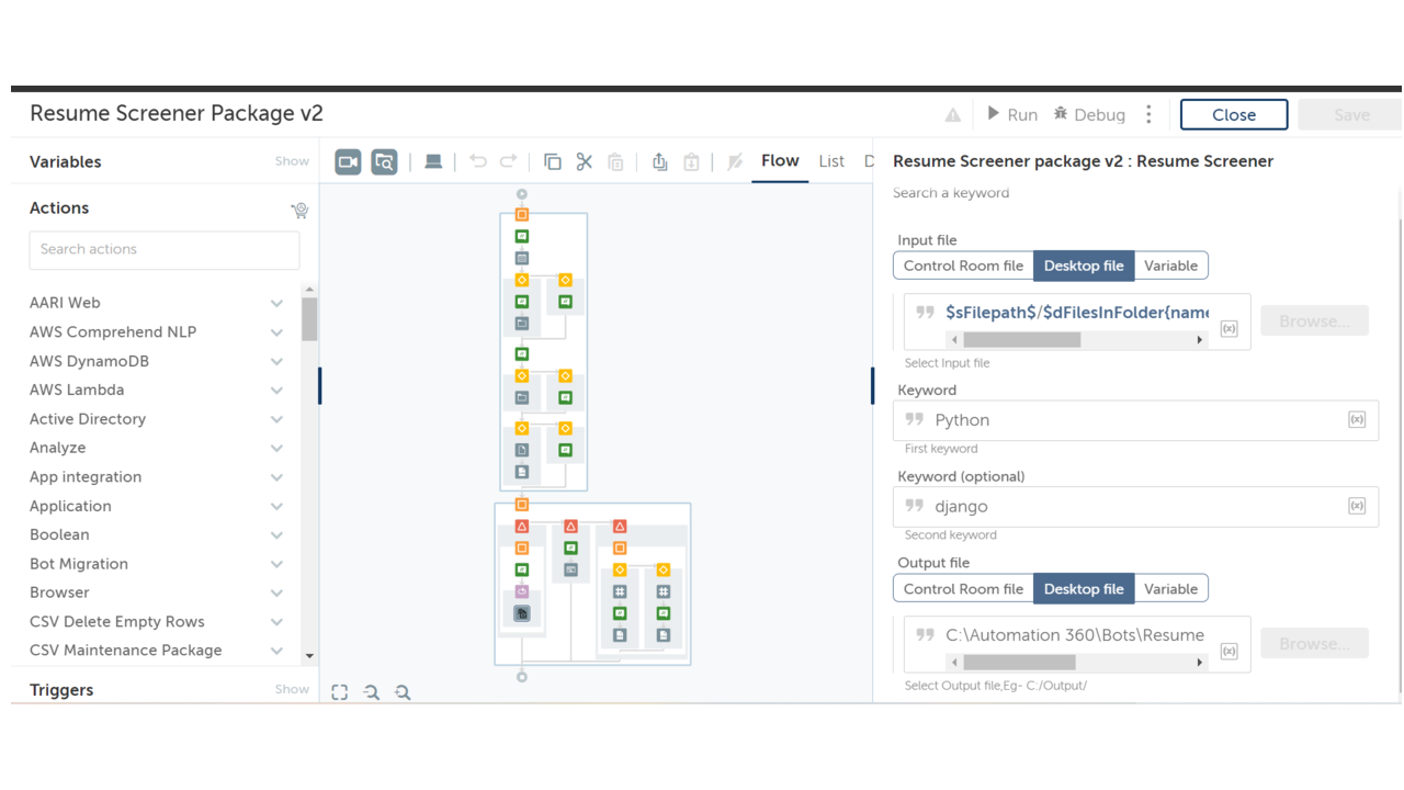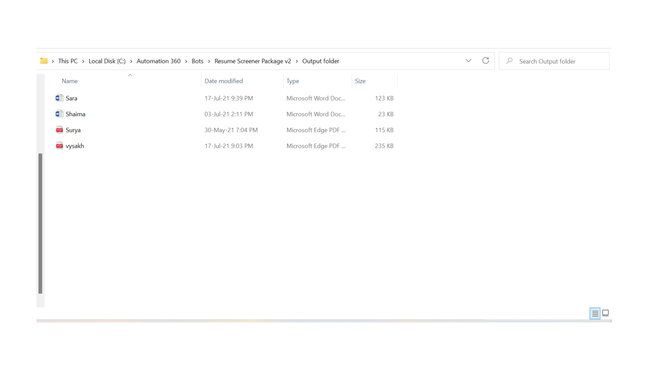 This package uses the action 'Resume Screener,' which is used to sort resumes that are both in .pdf and .docx formats. Keywords are used to sort the resumes. The input files containing resumes are screened using keywords and copied to the output folder. The user can sort the resumes as per their needs.