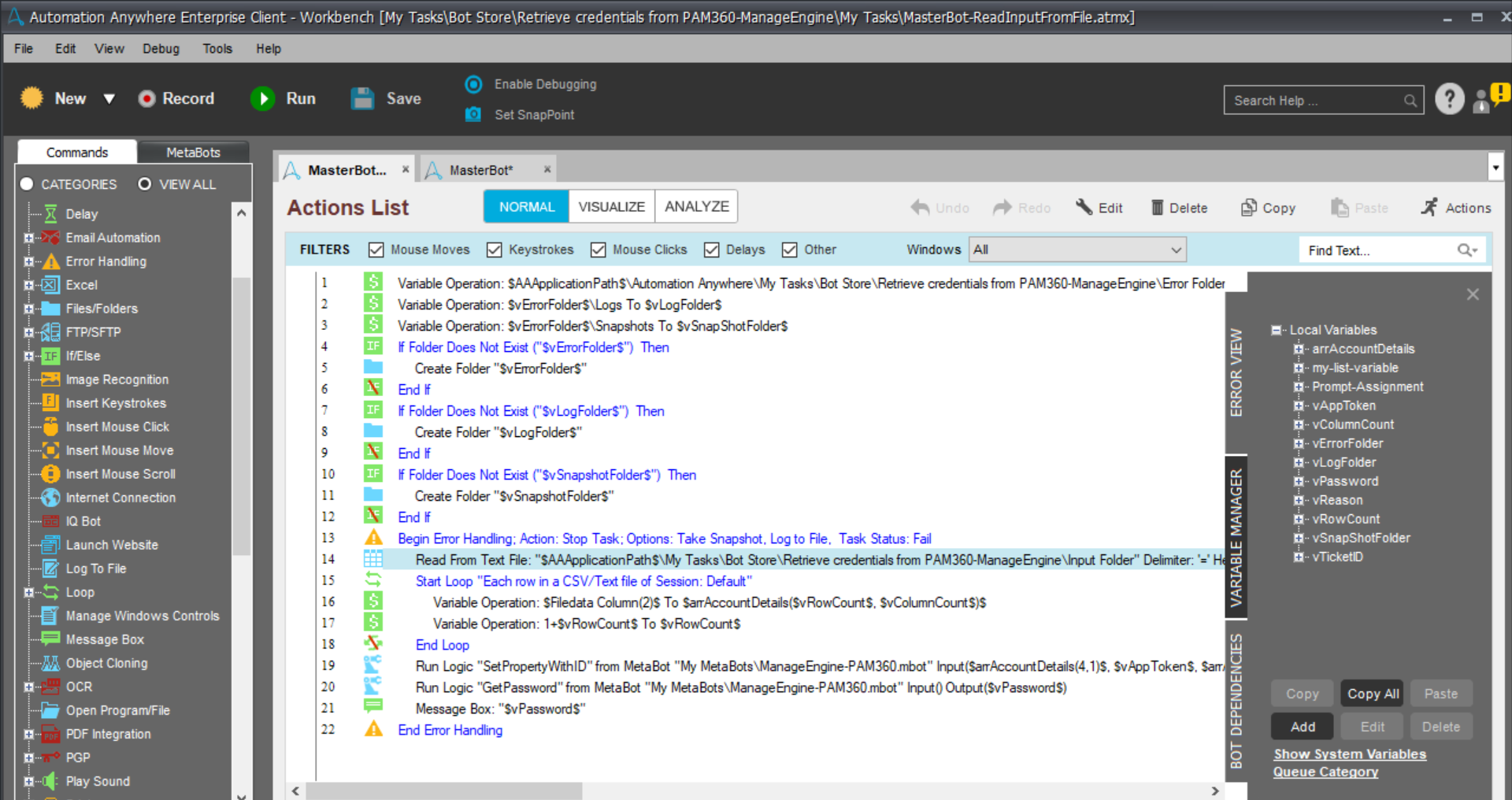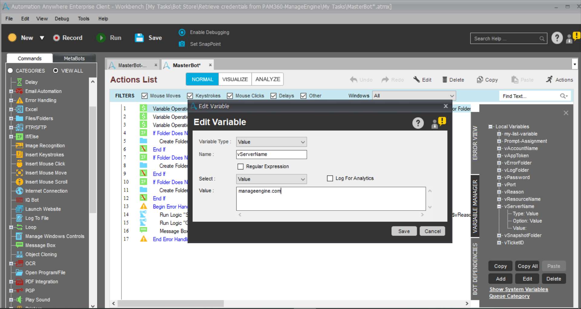 - Resource and Account detail variables can be directly obtained from PAM360 vault and fed directly to the bot