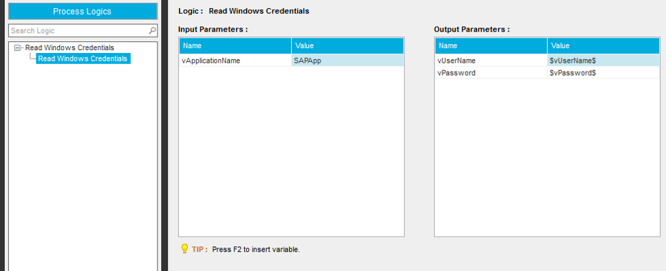 - Inputs: Target application name. (Unique name of credentials given at the time of creation Credential entry in Windows Credential Manager e.g. SAPApp)