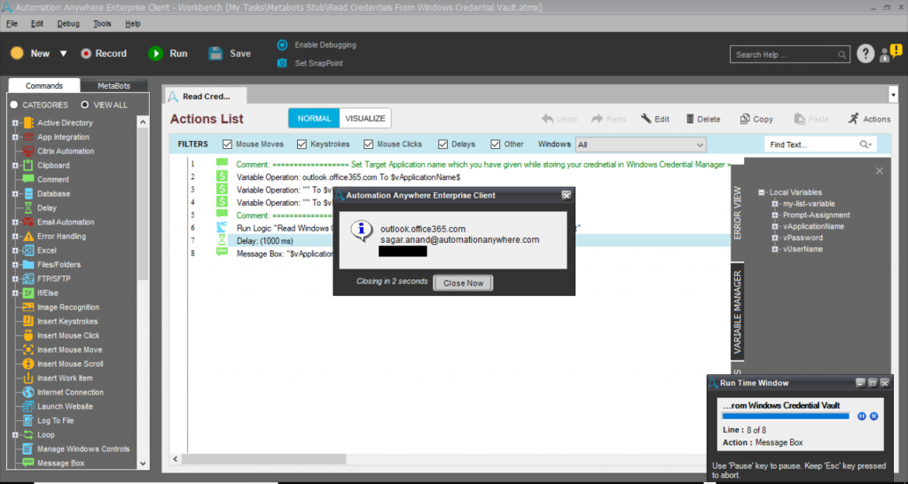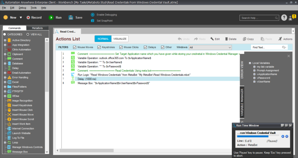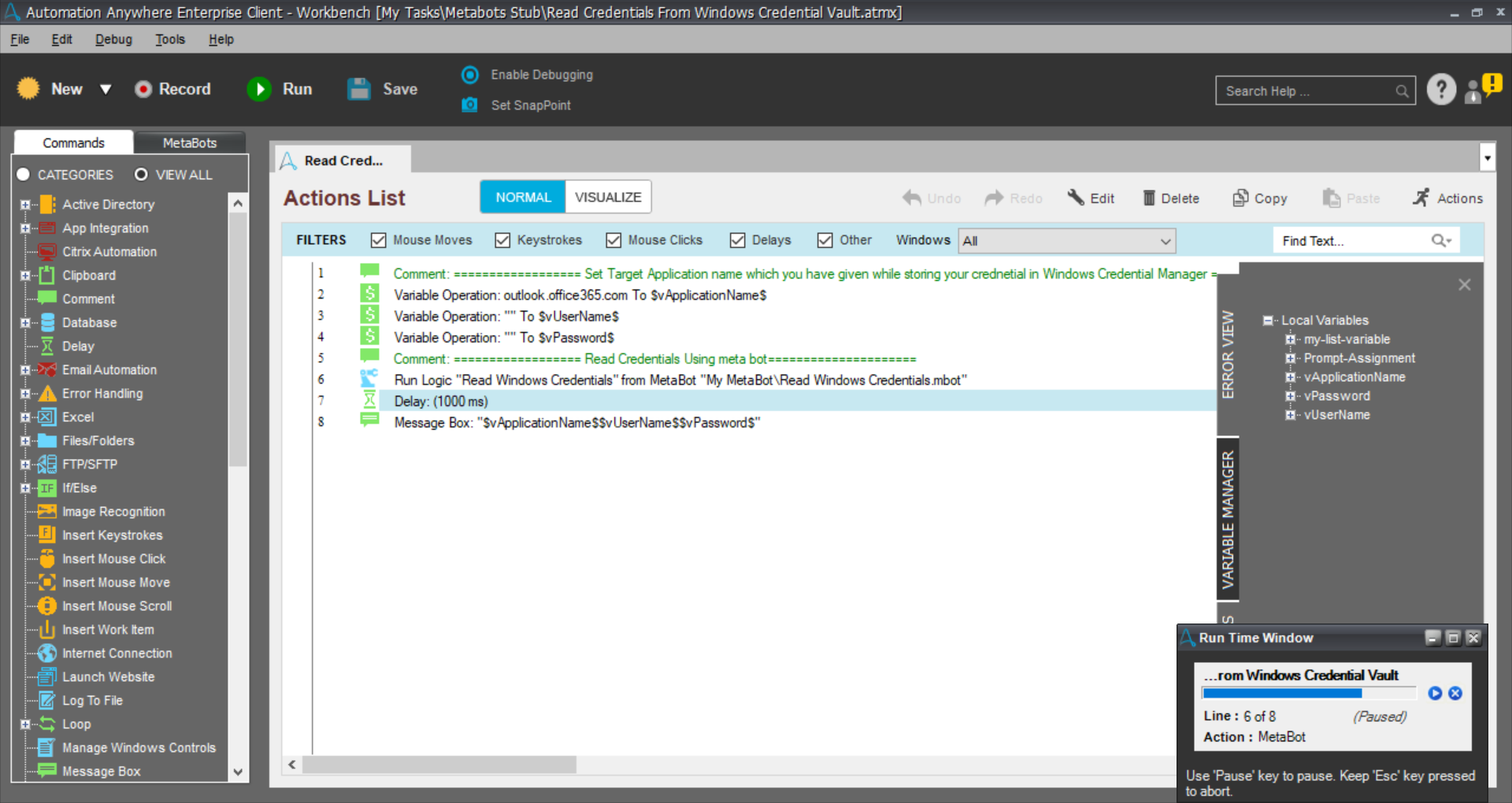 While the in-built Automation Anywhere Credential Vault works great, some organizations have had a history of using the Windows Credential Vault and prefer to continue using it with their RPA initiatives.