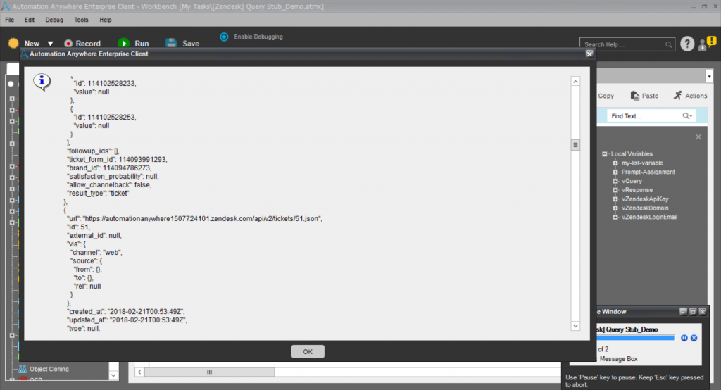 Use this bot to automate the process of querying Zendesk for support data. The bot supports Zendesk authentication as well as support for custom Zendesk support queries.