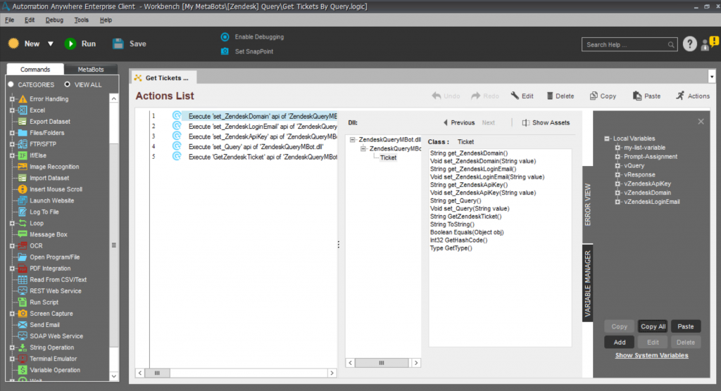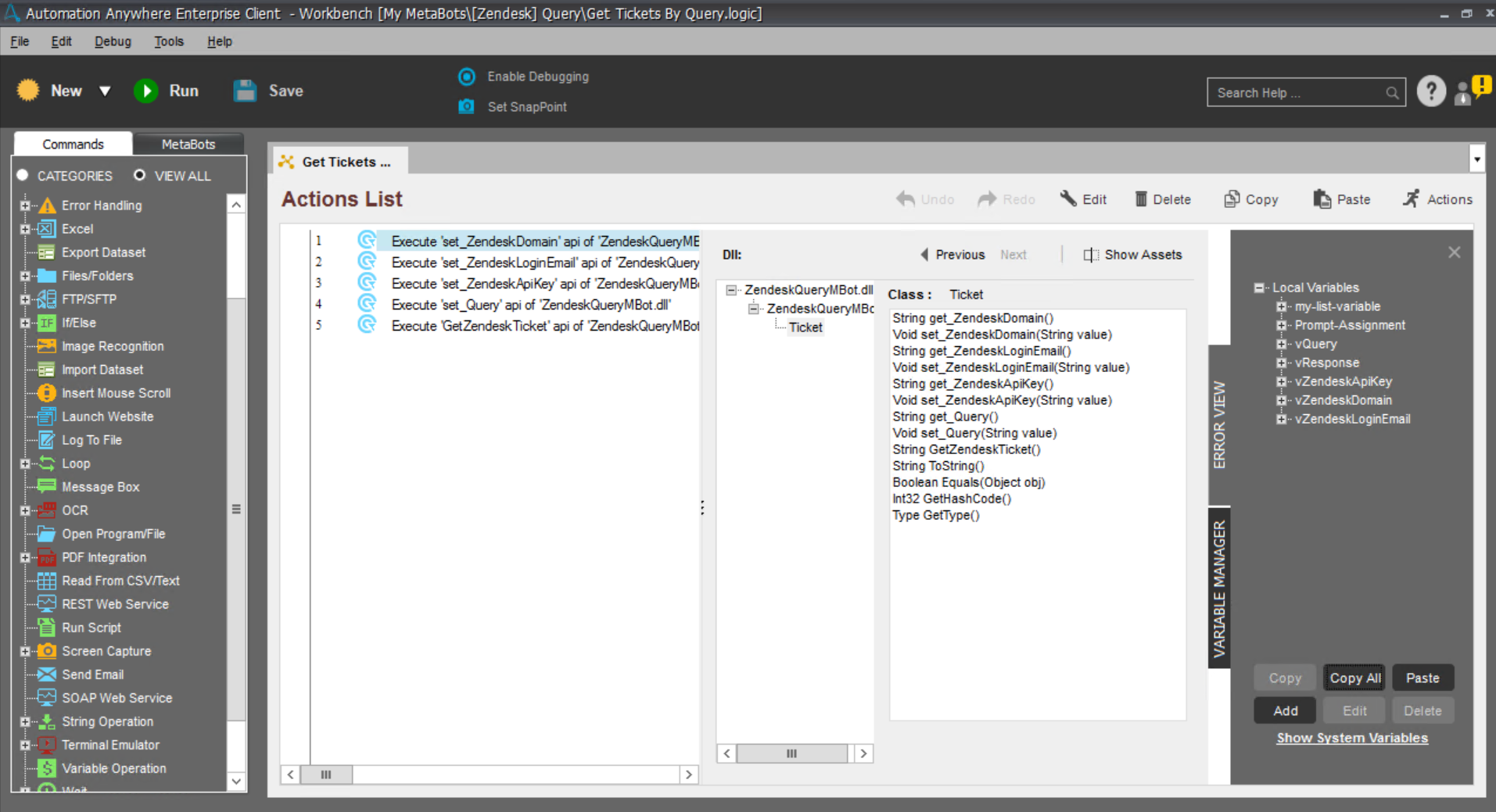 - Inputs: Accepts data from Query, Zendesk Domain, Zendesk Login Email, Zendesk API Key.