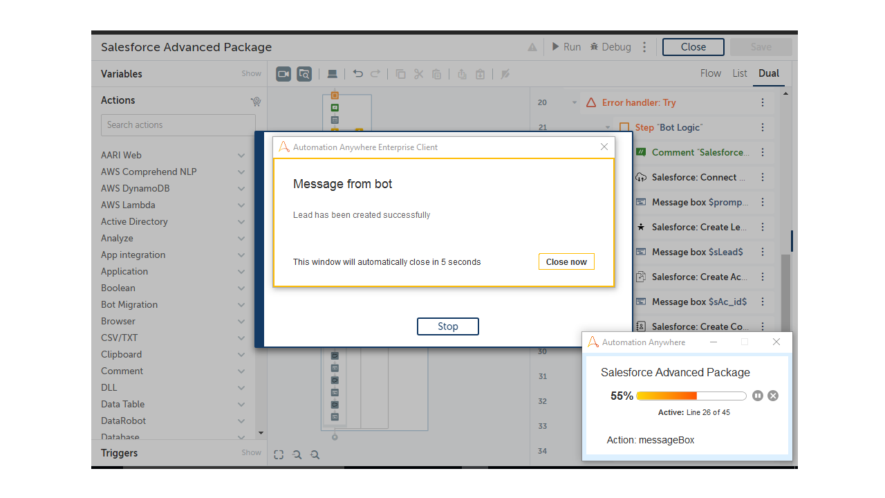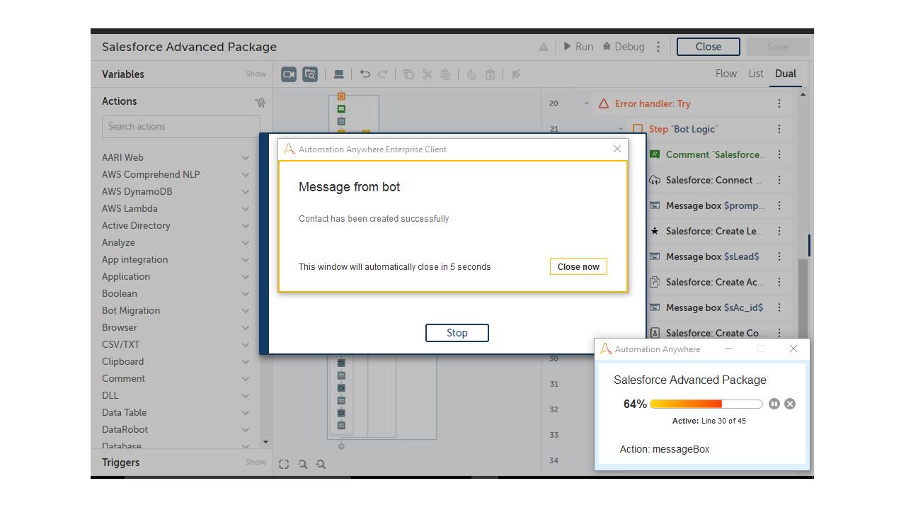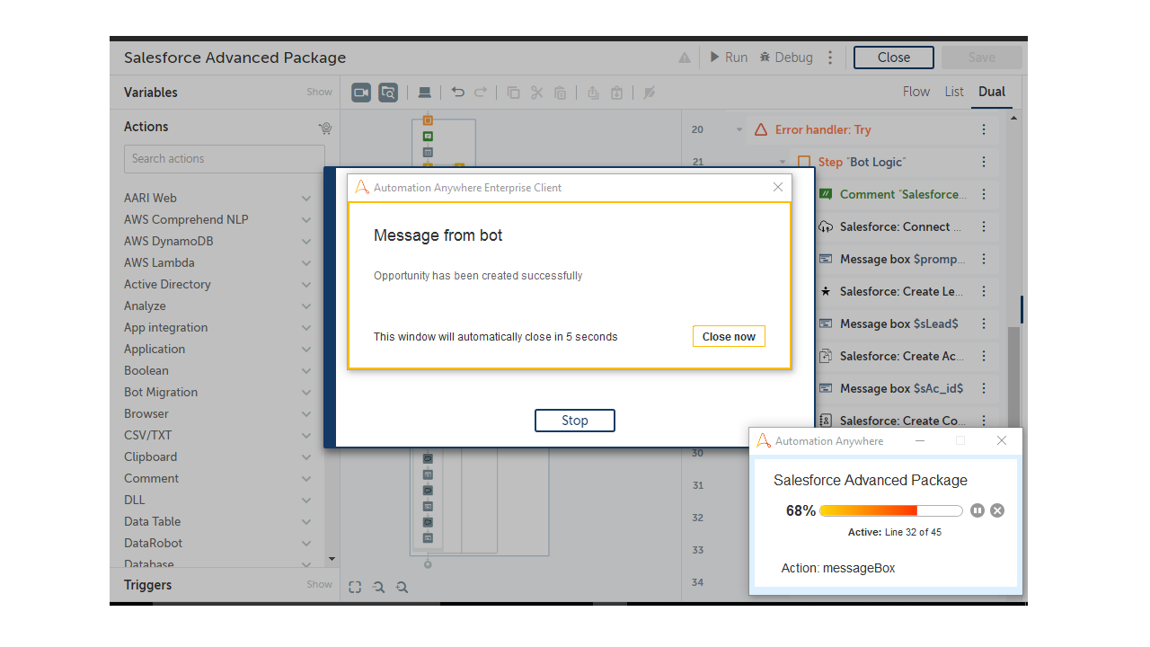 Salesforce Advanced Package includes several actions like Connect, Create Lead, Create Account, Create Contact, and Create Opportunity. These actions are unique in Salesforce API which performs Authentication through Connect action, Creating Lead for the User, Creating Individual Account, Contact, Opportunity for the User.