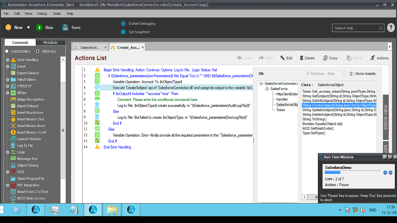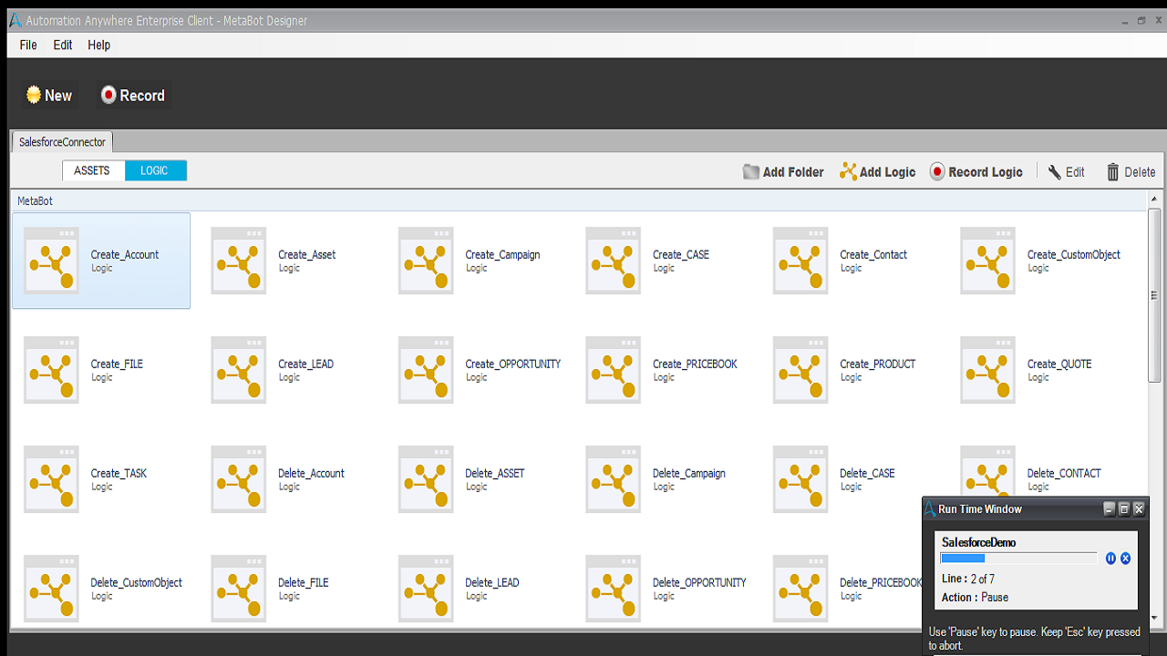 Salesforce is a leading provider of customer relationship management (CRM) platforms. This Salesforce connector can automate approximately 52 activities to perform various operations such as add, delete, update, or retrieve (add, delete, update, or get), on different objects from Salesforce. With the current version, we have prioritized entities account, asset, case, contact, lead, campaign, file, opportunity, task, price-book, product, quote. Users can perform any of the listed operations by providing required arguments just in few steps as users just need to consume the MetaBot from their existing AA workflow. Users can create a customized flow of the Salesforce operations by using the MetaBot functions. If the object name is different from the listed objects, the user can use the CustomObject MetaBot functions to perform the desire operation-for that user will need to provide object type in the input.