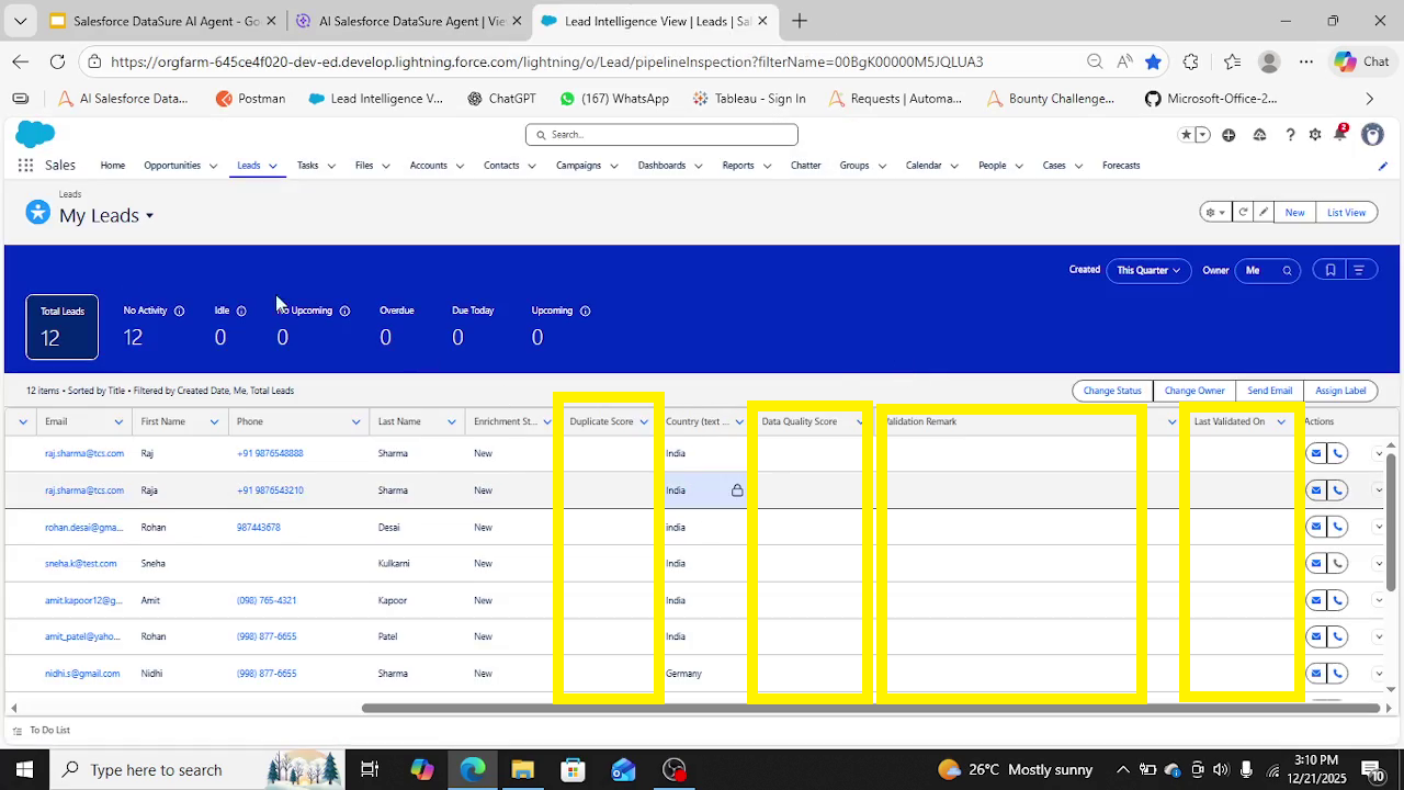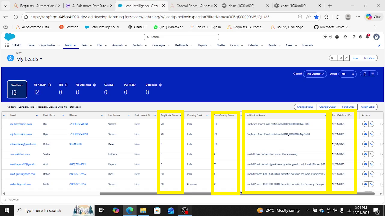 Input: Leads data on Salesforce with 4 additional columns. i.e.Data_Quality_Score__c(Number), Duplicate_Score__c (Number), Validation_Remark__c (Text(100)),Last_Validated_On__c (Date)