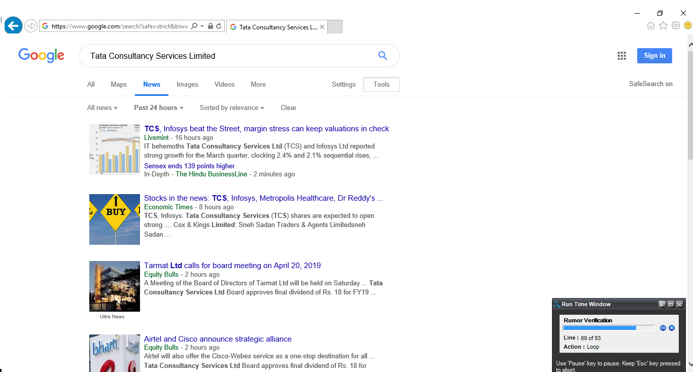 This Bot looks up the 'most-recent news' section on google for a list of companies (maintained in a CSV) and filters the news based on specific keywords and news sources (maintained in Excel)