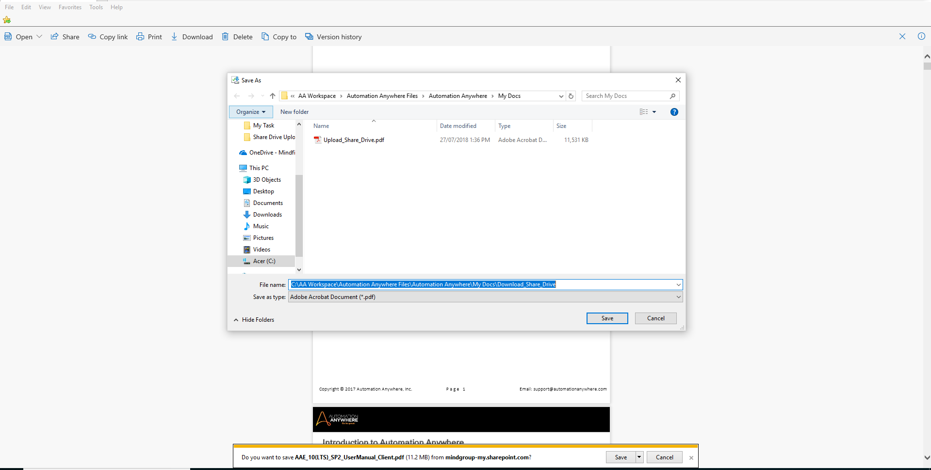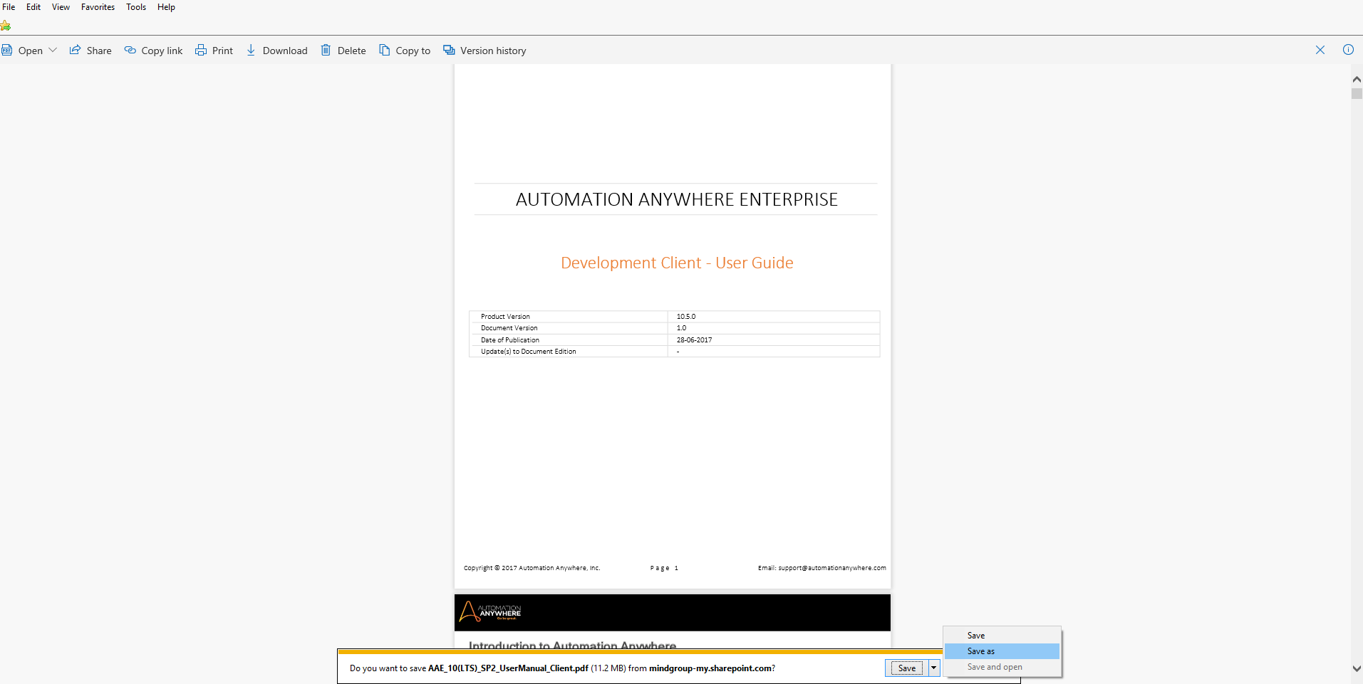 This bot downloads a file from SharePoint via Internet Explorer.