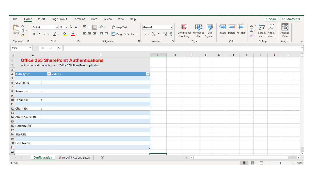 - Microsoft authentications (username, password, tenant id, client id, client secret value,siteurl, domain url, hostname)
