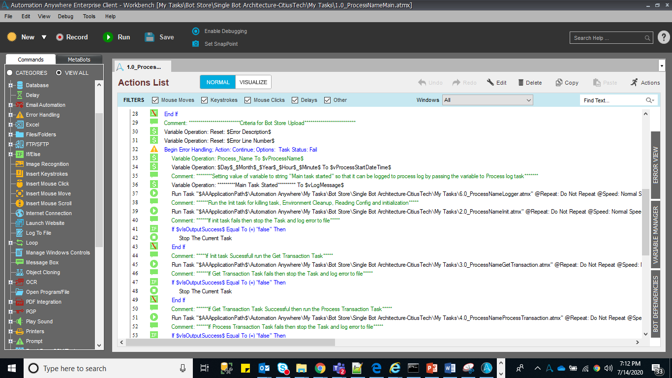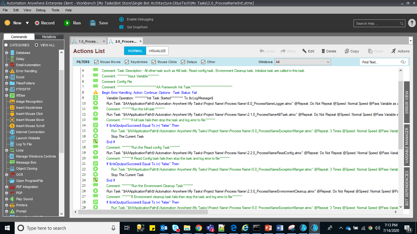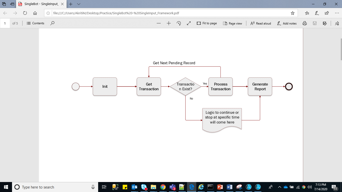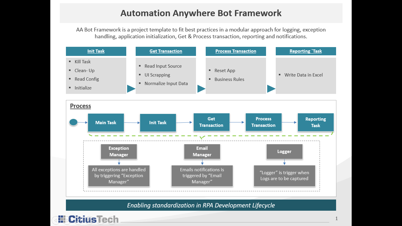 The Single Bot Architecture bot provides a framework to establish and enforce best practices in a modular approach. This framework is especially useful to ensure that all bots follow a standard for logging, exception handling, application initialization, get/process transactions, reporting, and notifications. All of this enables CoE's and RPA practices to ensure that best practices and standards are being followed across all bot development opportunities.