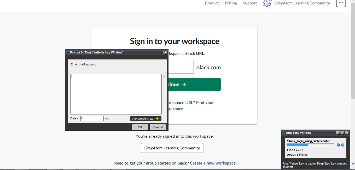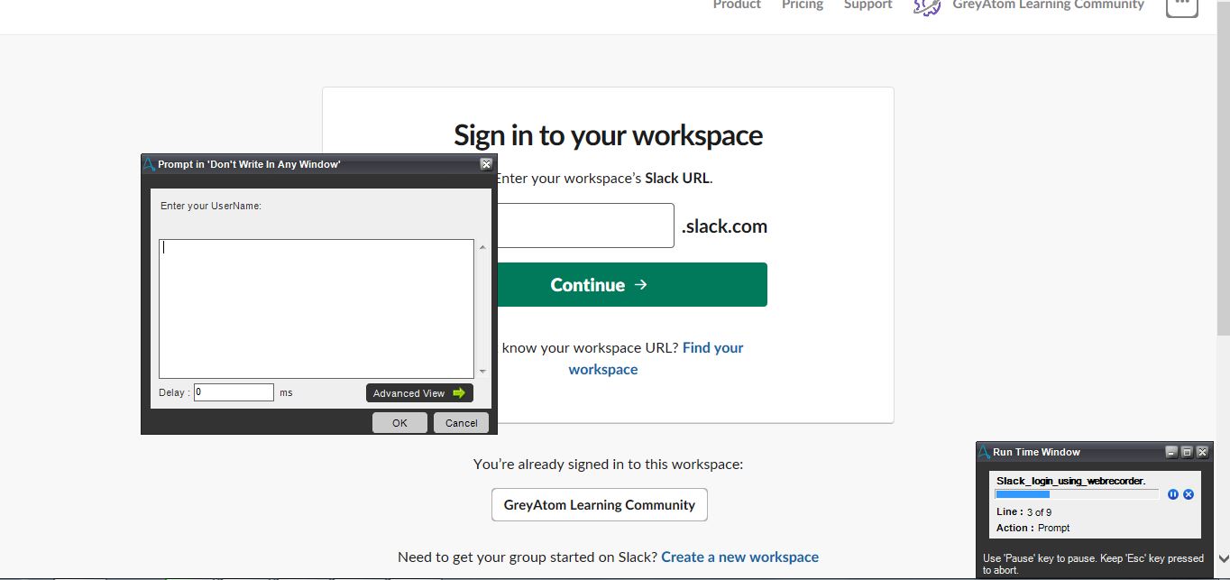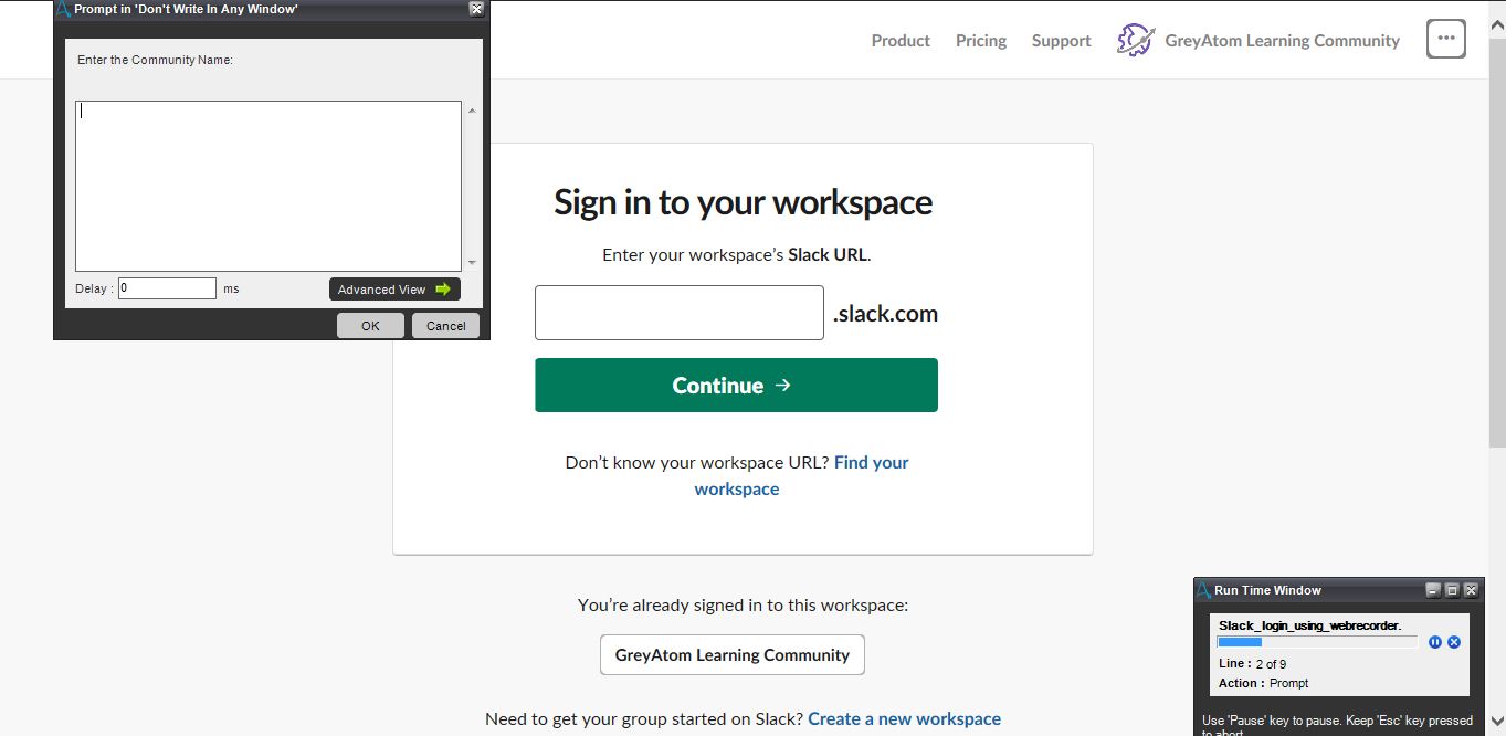 This bot will ask the following information using prompt: Community name, User Name and Password. It will use the above details to login to slack and access the community.