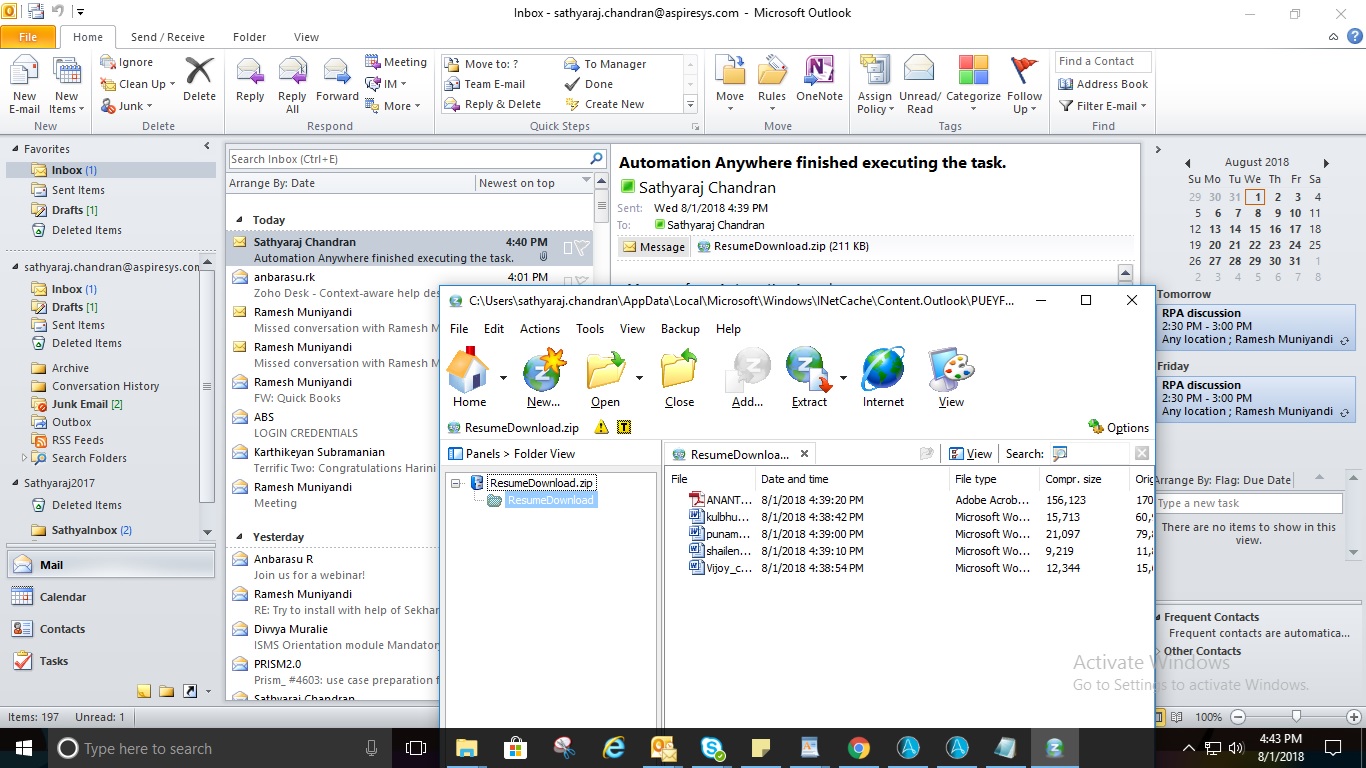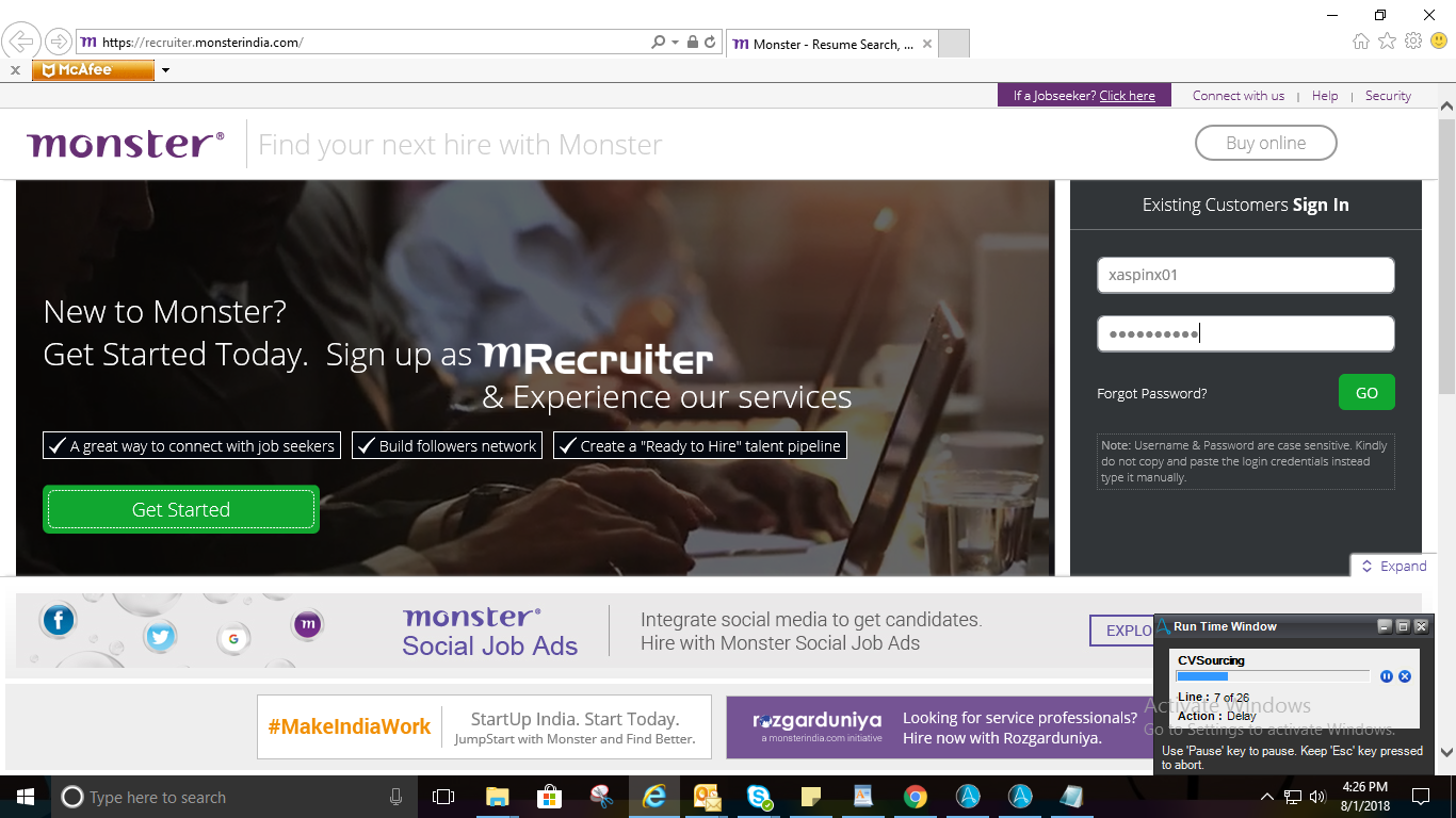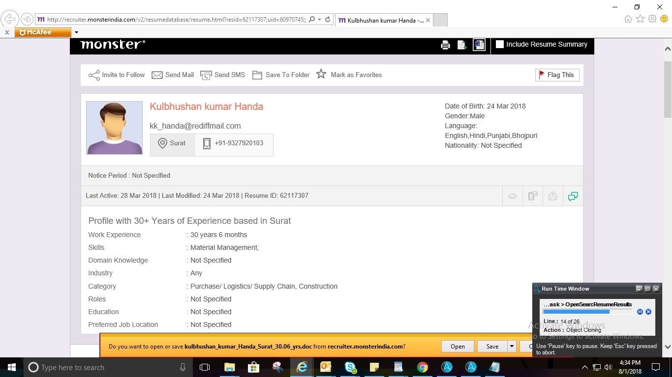 The bot will log in to the Job portal and key in the Skillset, Job Location, and Years of experience to fetch the resume. Appropriate resumes will be downloaded and emailed to the Recruiter