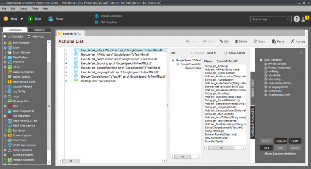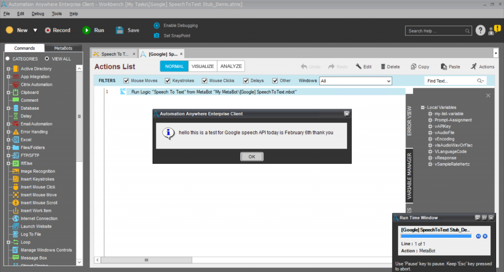 This bot is designed to work for any user by simply plugging this bot in an existing or new task to convert Speech to Text using Google Speech API. This bot provides possible alternative text from an audio file.