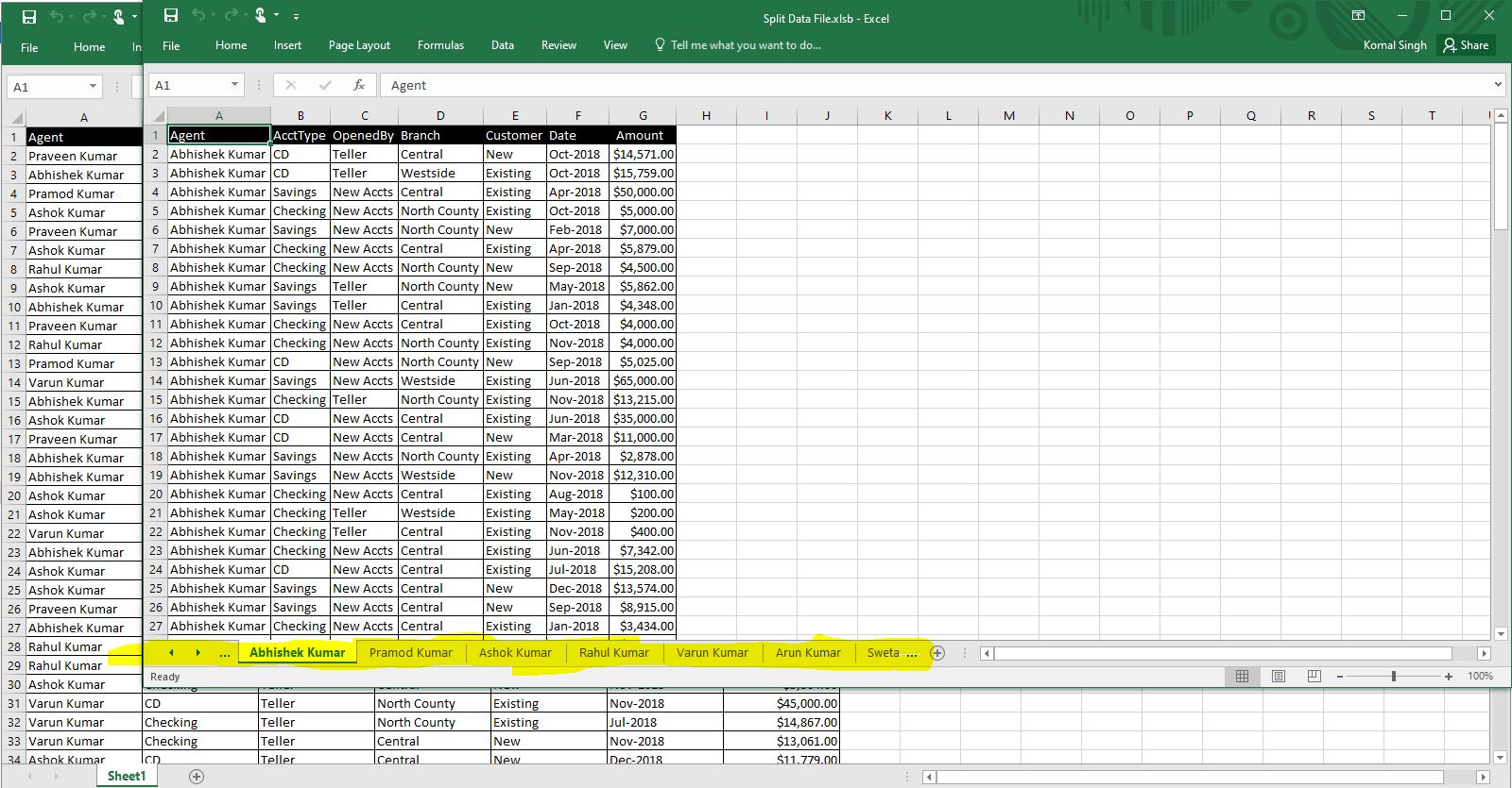 The bot extracts data from an input file and with the help of a macro file, creates sheets, and fills the data according to agent into each sheet.