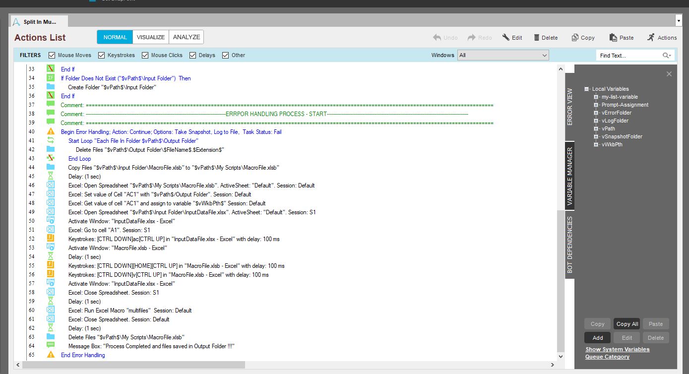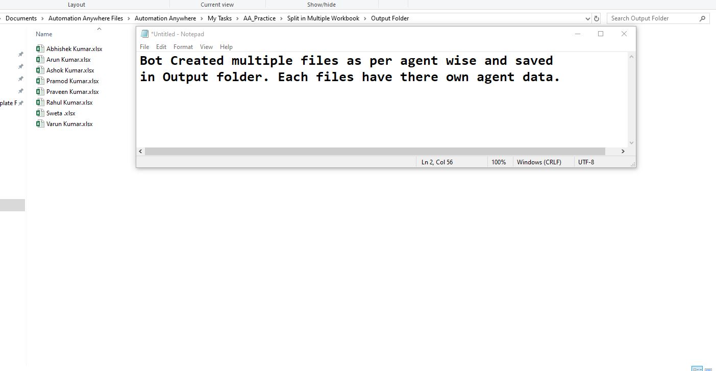 Bot extracts data from an input file and splits it into multiple workbooks, then saves it in an output folder. This bot can be used for multiple file creation. It uses a macro file that works quickly.