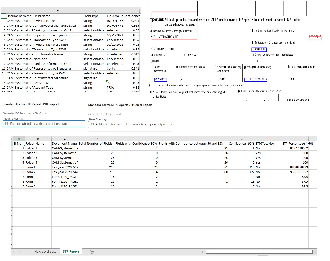 Standard Forms STP Report displays the fields with low confidence. It highlights these fields in the original document
