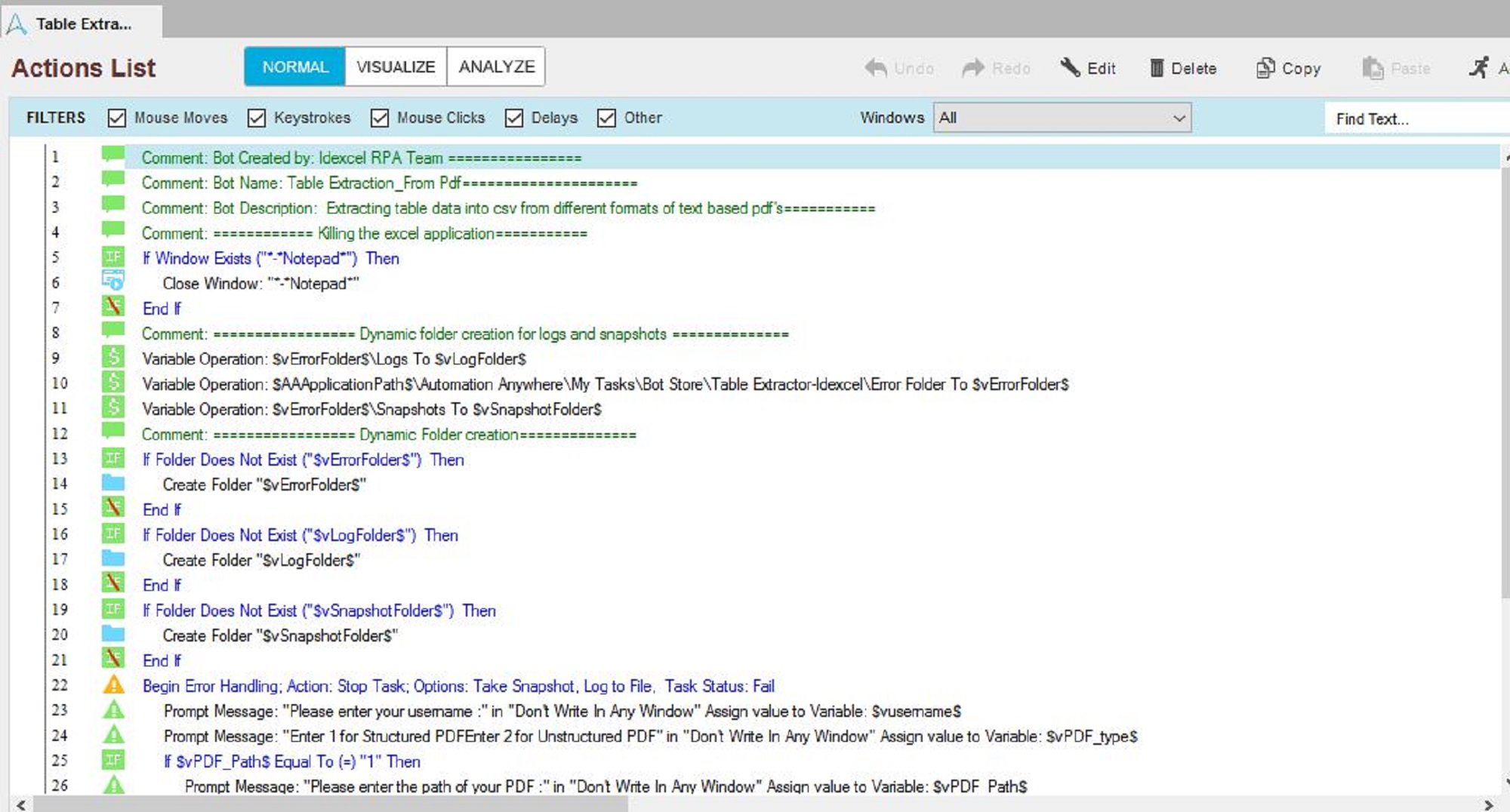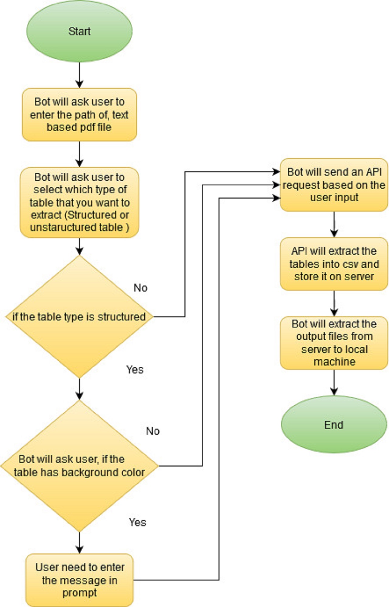 - The bot will send an API request through the REST web service to extract the tables from PDFs into CSV format.