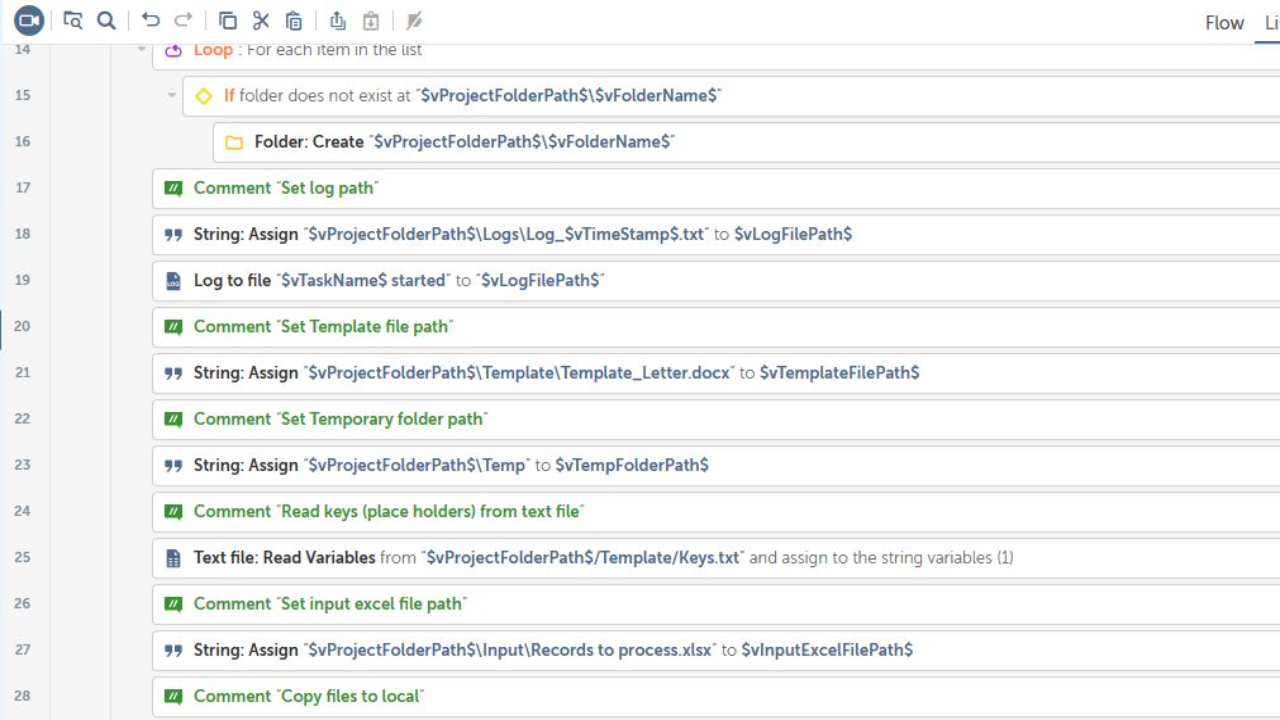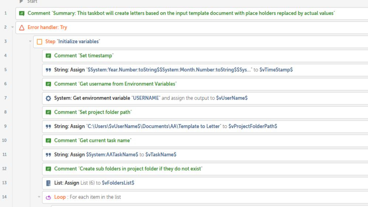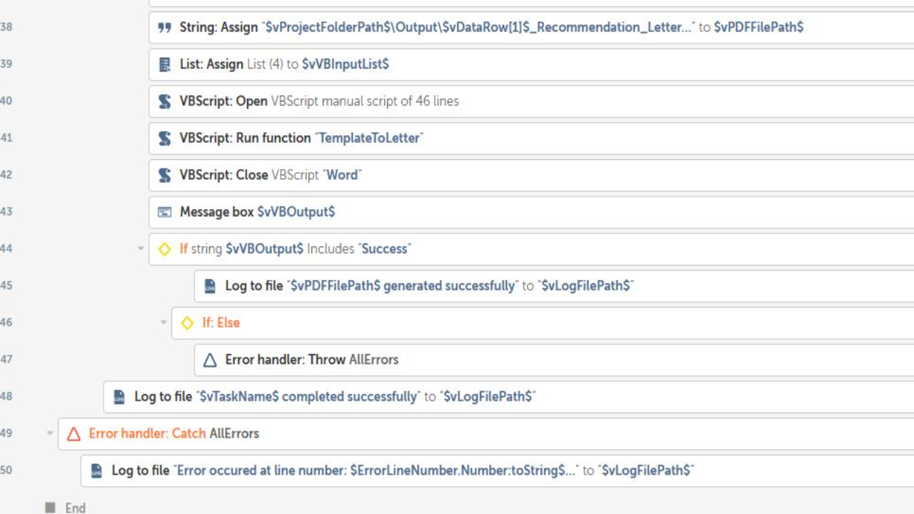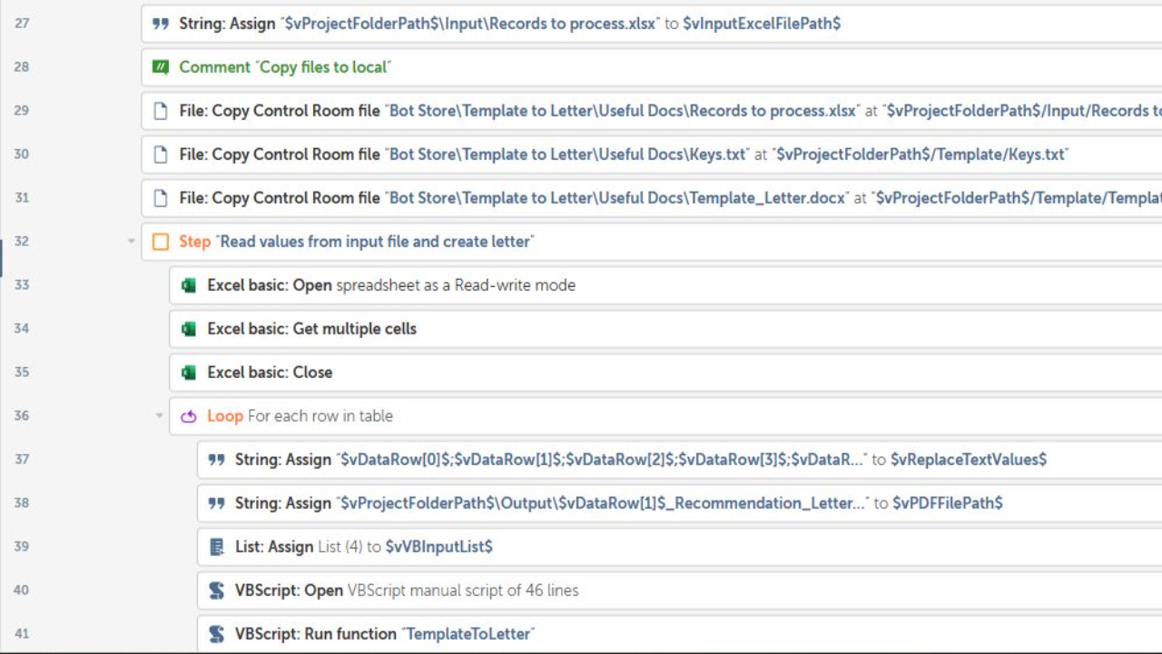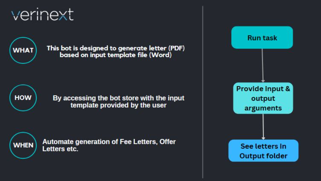 The purpose of this bot is to generate letters/documents based on the input template file (Word document). It generates the letters based on the placeholders present in the template file. It replaces placeholders with actual values from the input data source (can be Excel, Text etc.) and generates an output PDF file.