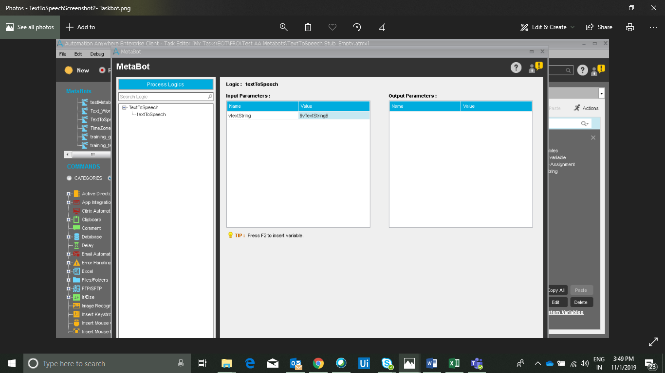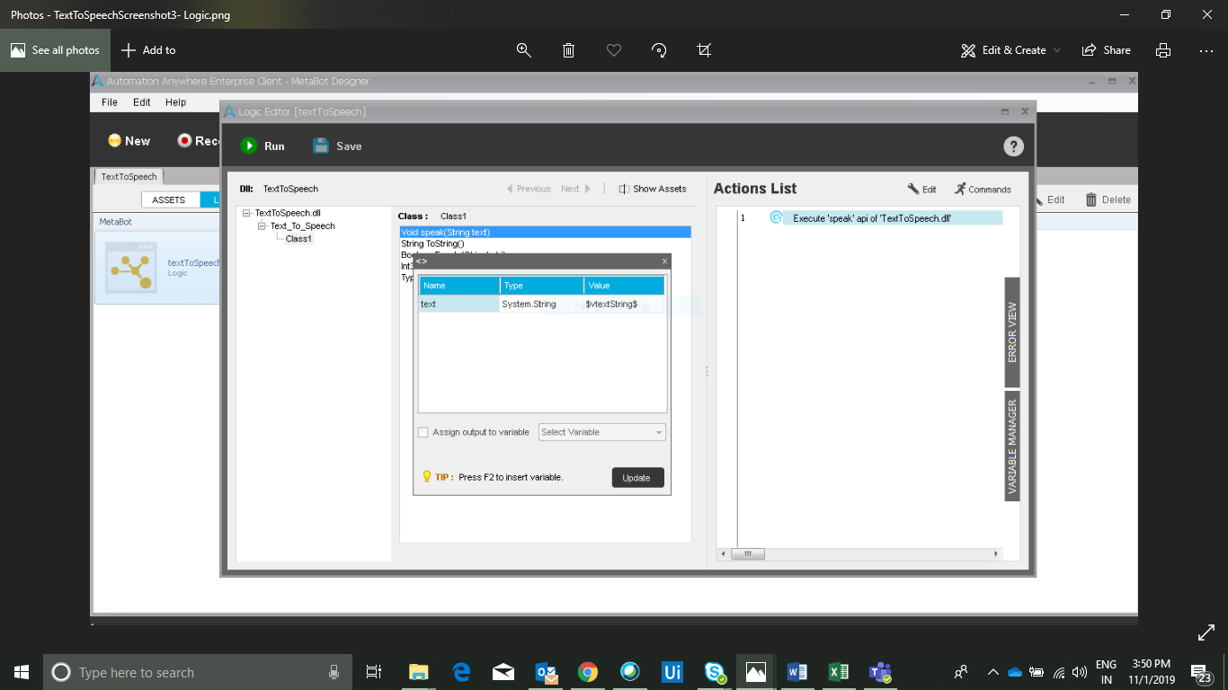 Read out the text passed in the input. This bot would render speech for a given text. This can be used for an easy operation to read out critical alerts which can help support functions and input text to the bot's human voice-based speech.