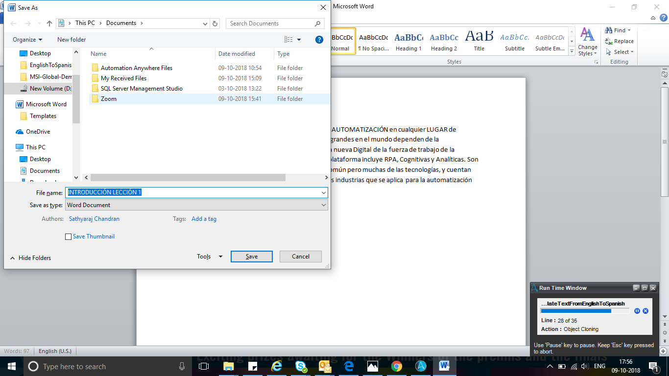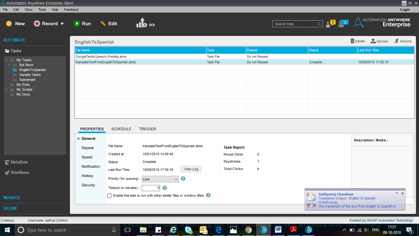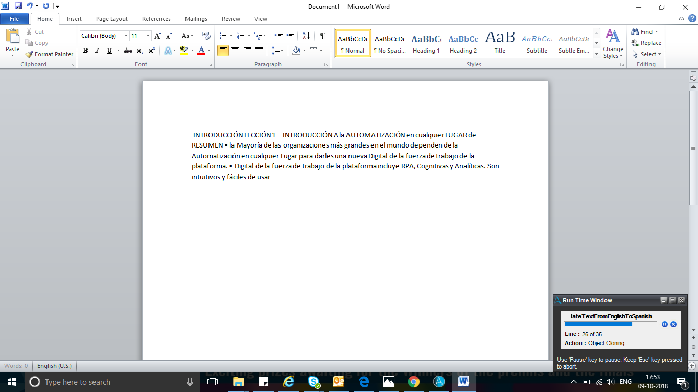 The bot reads English content from PDF file as input and converts it to Spanish. It also sends email to individual/teams.