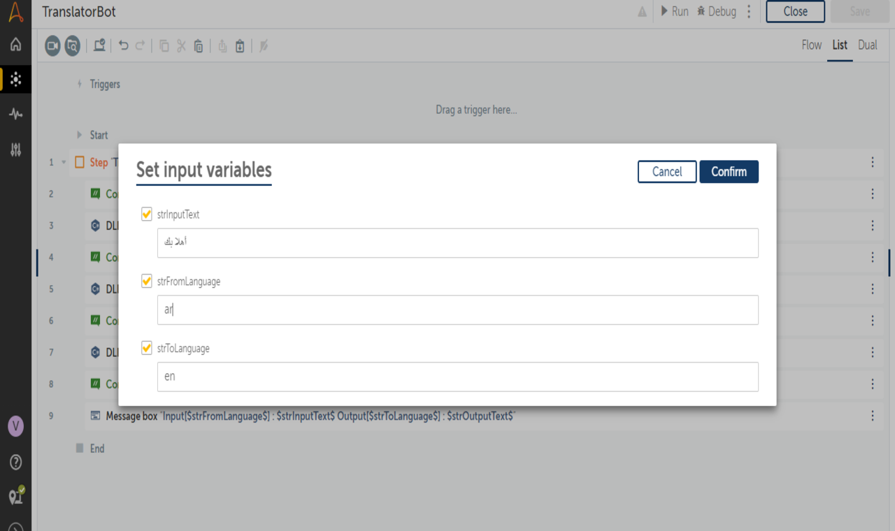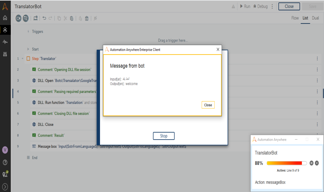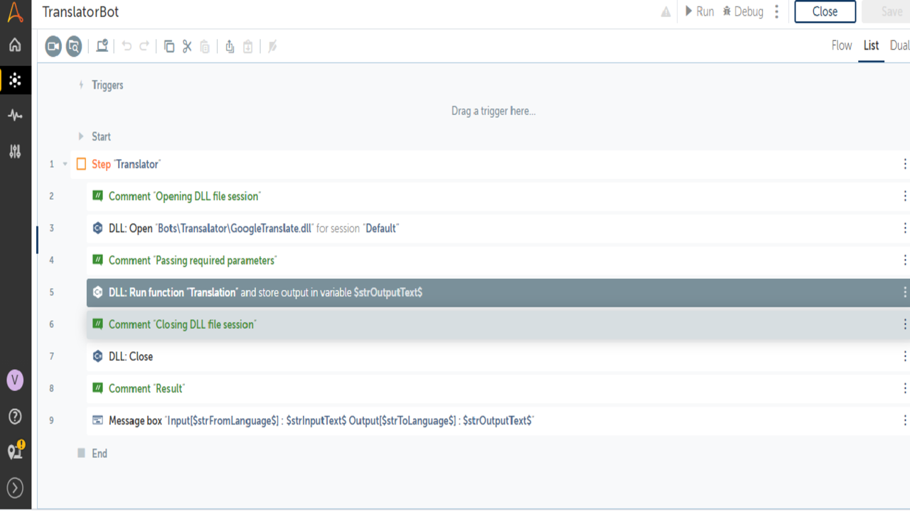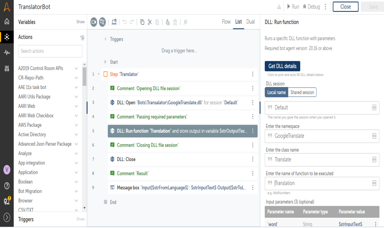 The Translator Bot Utility is used to convert text from one language to another language. It supports multiple languages. This bot is basically a wrapper with a .Net DLL file which helps to convert text from one language to another language. No external access is required for using the Bot or Command Package. Just import the task and plug and play with your process.