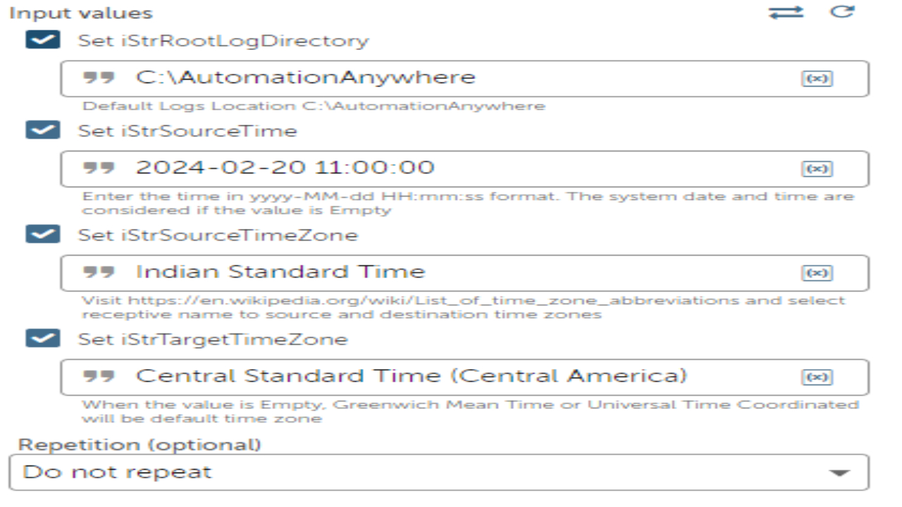 - Before running the automation, the user needs to fill in the source and target time zones for conversion along with the date and time in the prescribed format