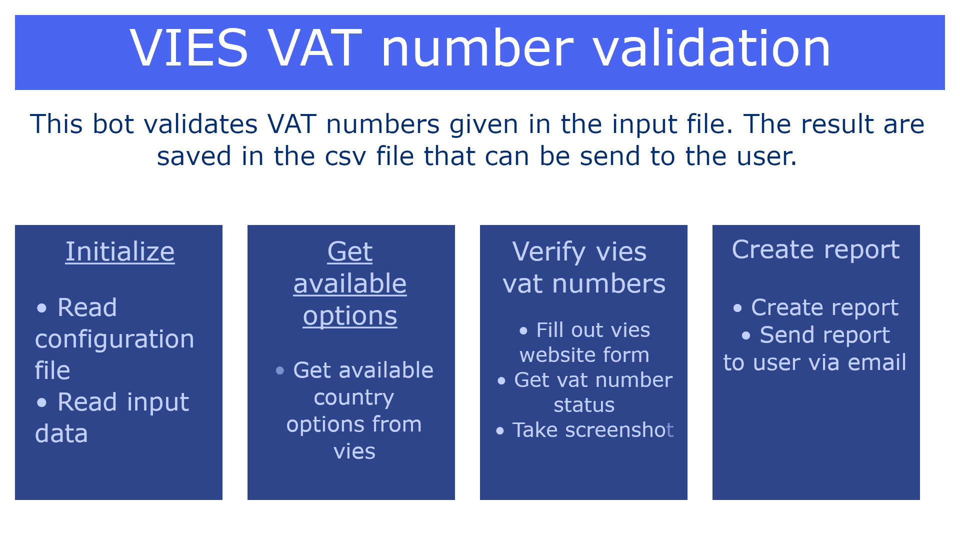 This bot verifies the validity of VAT numbers from a source file which is read at once and then processed sequentially. The numbers and their statuses are saved in the external file. The bot also captures the screen of the website with a verified number. The report could be sent to the user via email.