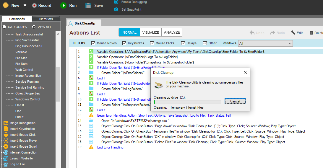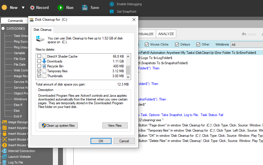 The bot runs the Windows Disk Cleanup utility to clear unwanted files from the Windows 10 system
