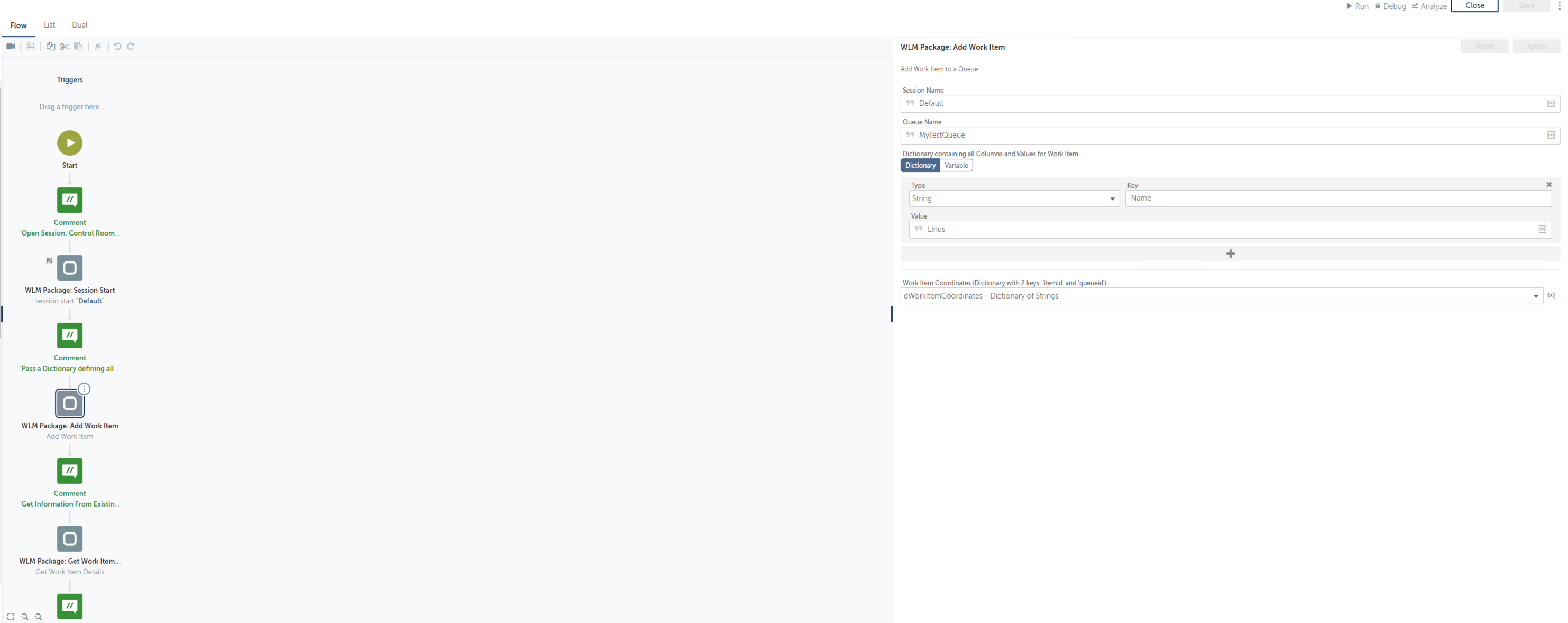 - Add Work Item: Add a work item to Queue and assign values to each column