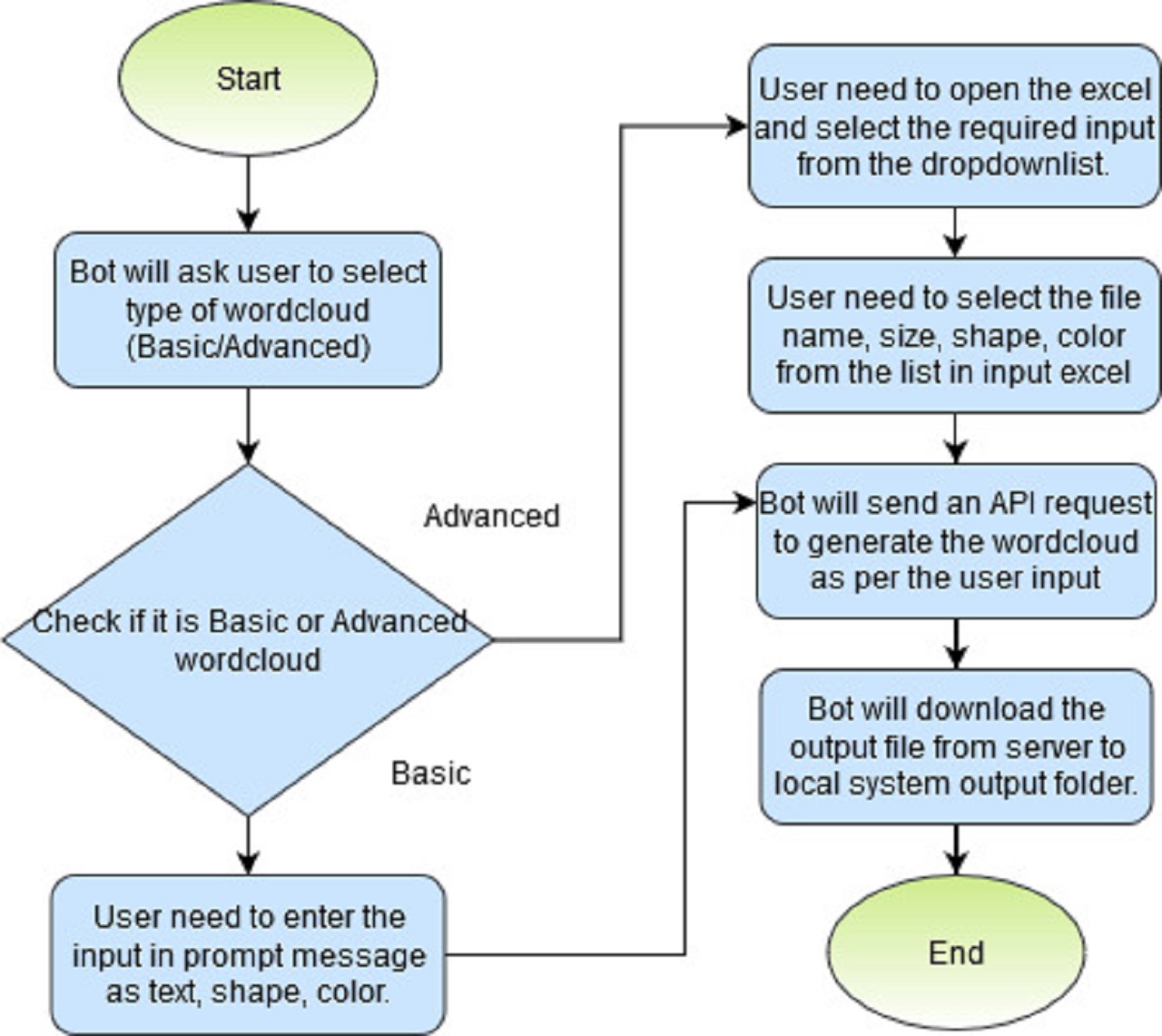 1. If the user wants to go for a basic word cloud, the bot will ask the user to enter the input text, shape, and color to generate the word cloud.