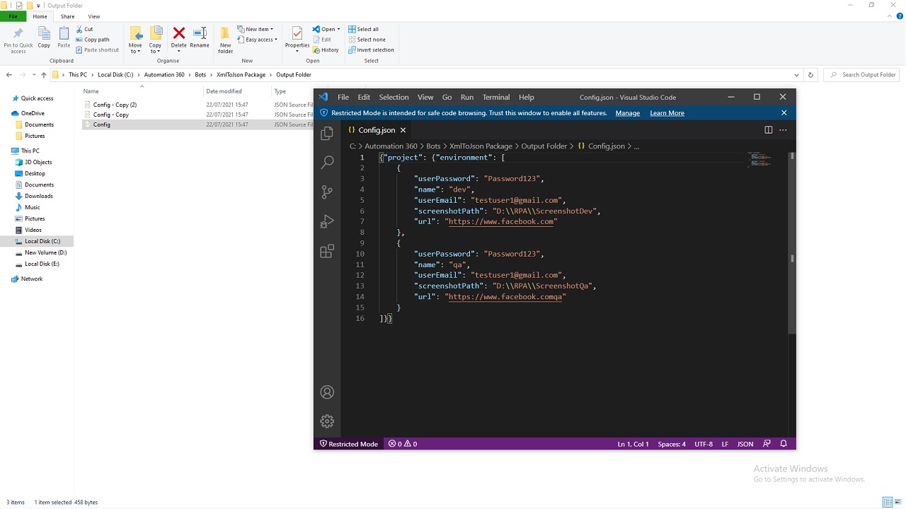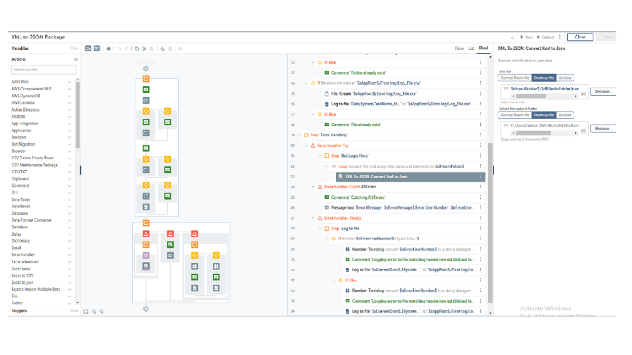 This package includes an action which is used to convert XML files into JSON files. Multiple files can be converted at the same. The loop action is used to convert the multiple files from a folder. The user can directly edit the output JSON files which is automatically generated.